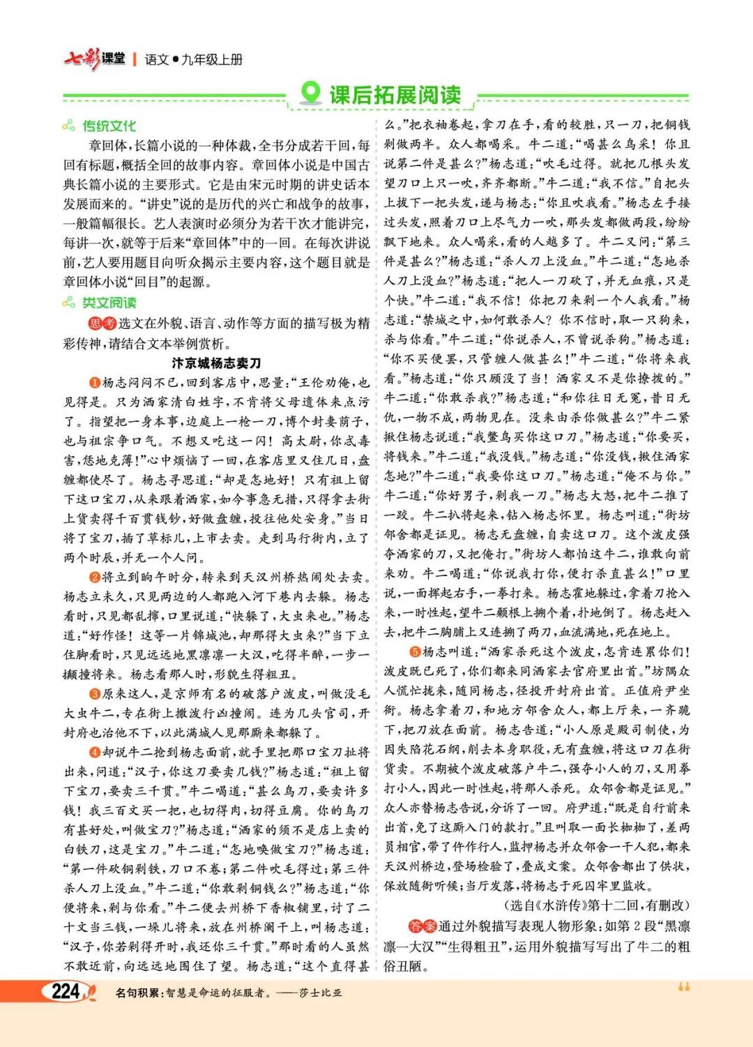 当时杨志和那僧人斗到四五十合,不分胜败。那和尚卖个破绽,托地跳出圈子外来,喝一声:“且歇!”两个都住了手。杨志暗暗地喝彩道:“那里来的这个和尚,真个好本事,手段高,俺却刚刚地只敌的他住。”那僧人叫道:“兀那青面汉子,你是甚么人?”杨志道:“洒家是在东京制使杨志的便是。”那和尚笑道:“你不是在东京卖刀杀了破落户牛二的?”杨志道:“你不见俺脸上金印?”那和尚笑道:“却原来在这里相见。”杨志道:“不敢问师兄却是谁?缘何知道洒家卖刀?”那和尚道:“洒家不是别人,俺是延安府老种经略相公帐前军官鲁提辖的便是。为因三拳打死了镇关西,却去五台山净发为僧。人见洒家背上有花绣,都叫俺做花和尚鲁智深。”