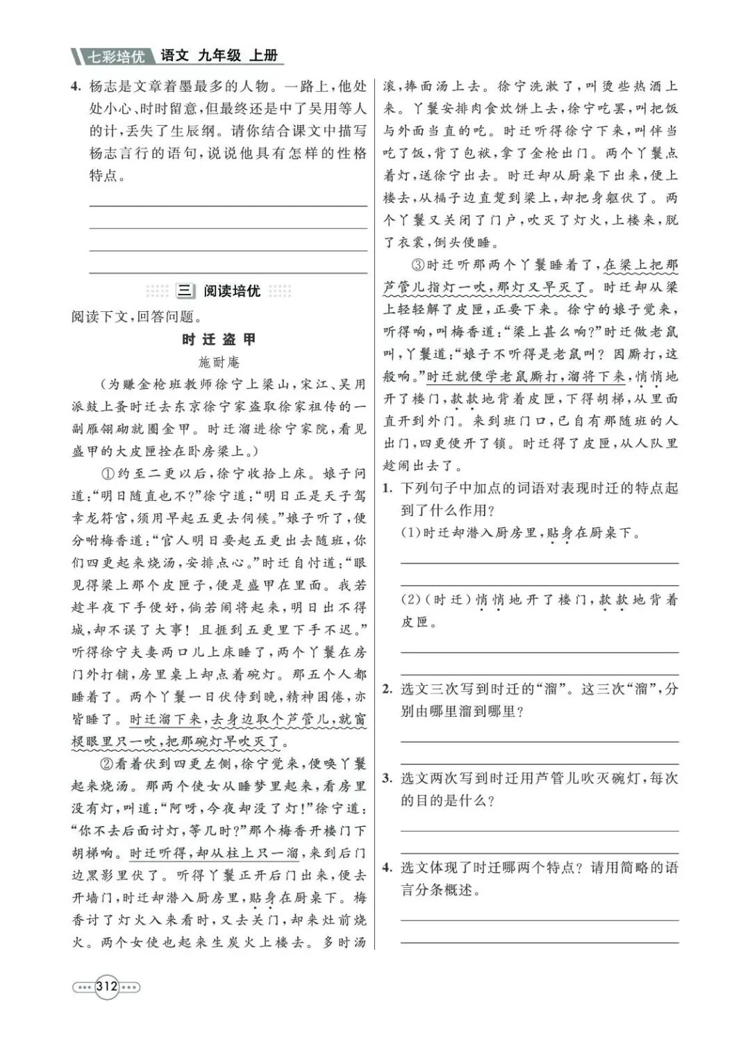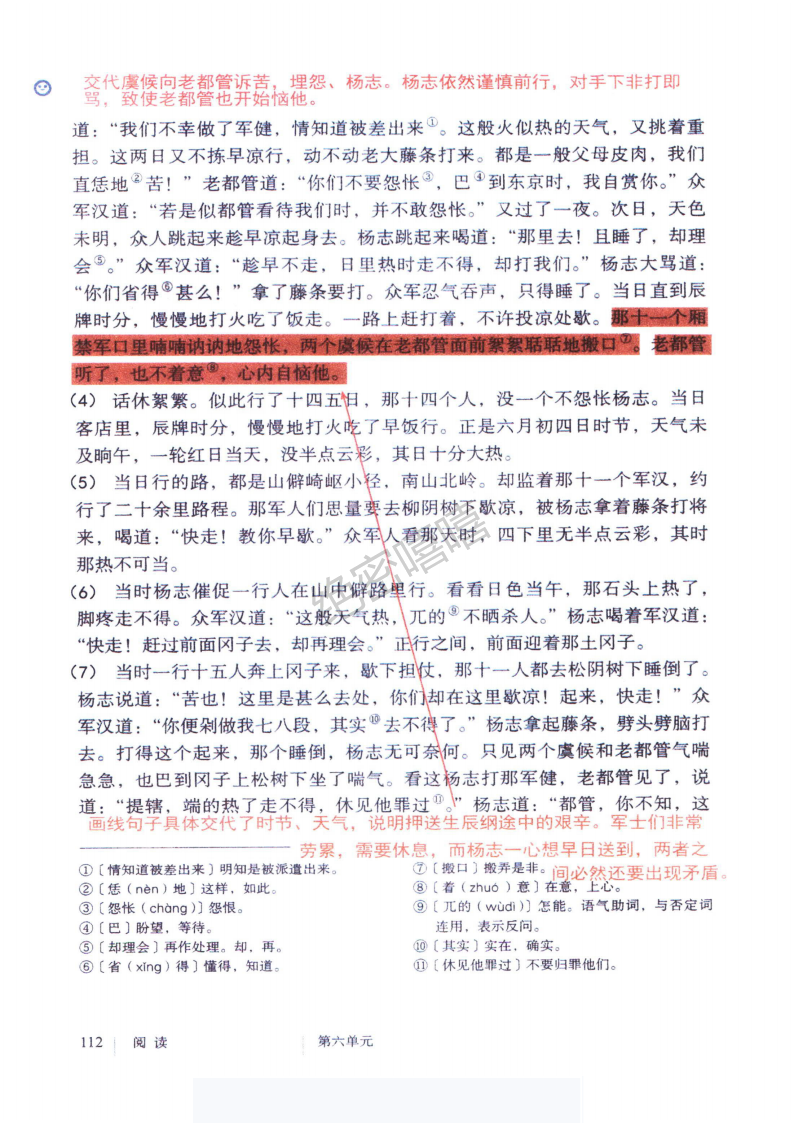 第一部分(1—4):写杨志在押送生辰纲途中与老都管、虞候及众军汉之间的矛盾,为下文生辰纲被劫作铺垫。