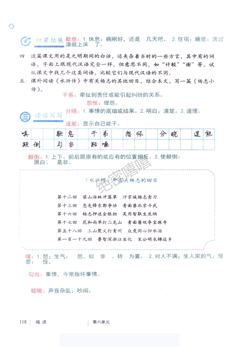 ⑦次日,众泼皮商量,凑些钱物,买了十瓶酒,牵了一个猪,来请智深。都在廨字安排了,请鲁智深居中坐了,两边一带坐定那二三十泼皮饮酒。智深道:“什么道理,叫你众人们坏钞。”众人道:“我们有福,今日得师父在这里,与我等众人做主。”智深大喜。吃到半酣里,也有唱的,也有说的,也有拍手的,也有笑的。正在那里喧哄,只听得门外老鸦哇哇的叫。众人有扣齿的,齐道:“赤口上天,白舌人地。”智深道:“你们做什么鸟乱?”众人道:“老鸦叫,怕有口舌。”智深道:“那里取这话!”那种地道人笑道:“墙角边绿杨树上新添了一个老鸦巢,每日只咶到晚。” 众人道:“把梯子去上面拆了那巢便了。”有几个道:“我们便去。”智深也乘着酒兴,都到外面看时,果然绿杨树上一个老鸦巢。众人道:“把梯子上去拆了,也得耳根清净。”李四便道:“我与你盘上去,不要梯子。”智深相了一相,走到树前,把直裰脱了,用右手向下,把身倒缴着,却把左手拔住上截,把腰只一趁,将那株绿杨树带根拔起。众泼皮见,一齐拜倒在地,只叫:“师父非是凡人,正是真罗汉!身体无千万斤气力,如何拔得起!”智深道:“打甚鸟紧!明日都看酒家演武使器械。”众泼皮当晚各自散了。从明日为始,这二三十破落户见智深匾匾的伏,每日将酒肉来请智深,看他演武使拳。