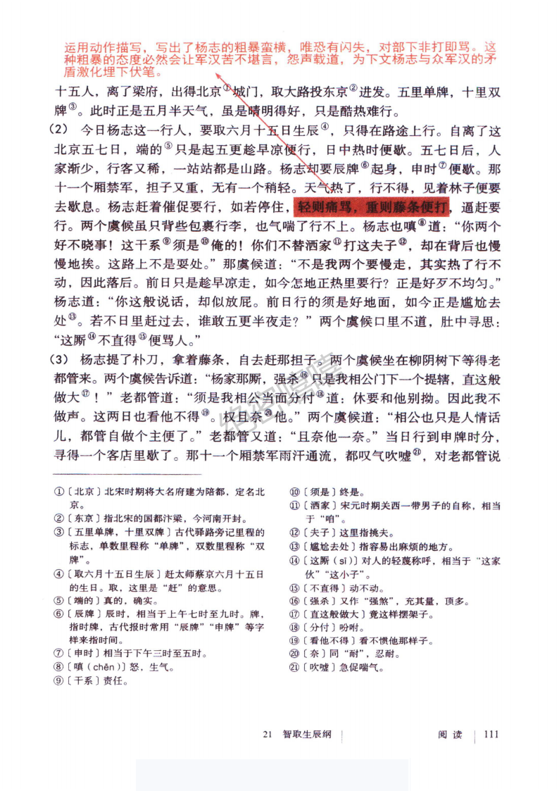 “搬口”,而老都管则也是“心内自恼他”,众人的表现虽不同,但埋怨对象却一致。众人对杨志的不满,表明杨志一行人已失去了内部的团结,黄泥冈“生辰纲”被劫也就显得顺理成章了。同时,这也预示了矛盾必然会被激化,为下文情节的发展作了铺垫。