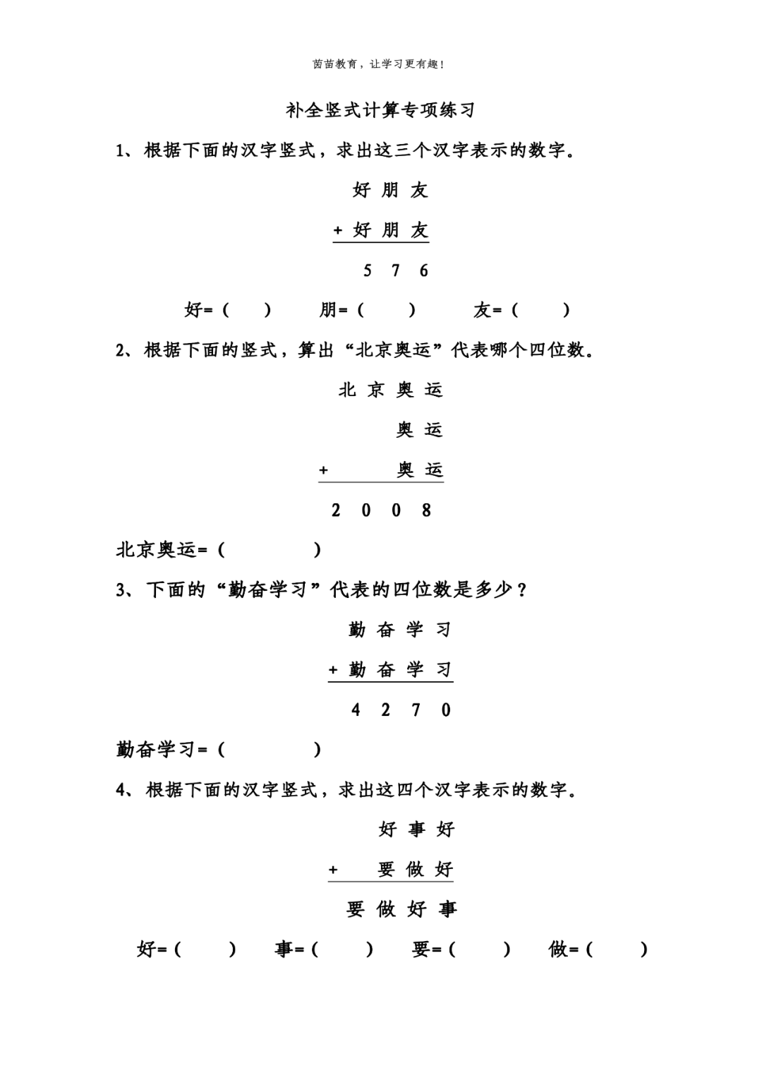 接下来,我们一起来看看这份汉字竖式计算专项练习