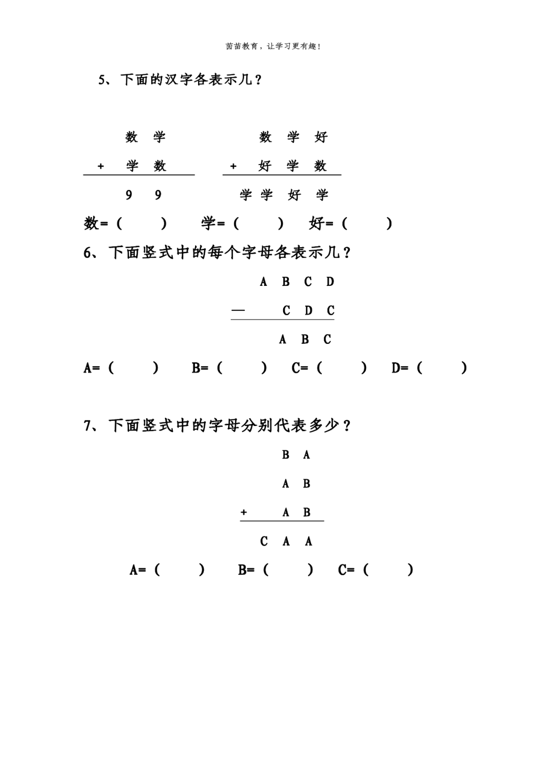 第5题:学=1,数+学=9,数=8;好+数=11,好=3,