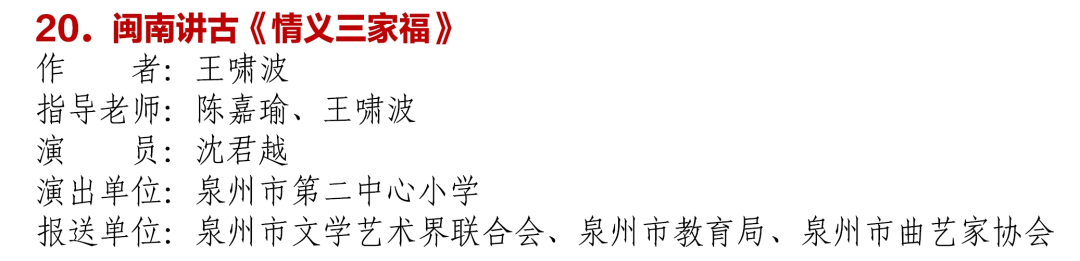 经过激烈的海选、视频评选赛和现场决赛,最终41件作品分获节目奖一、二、三等奖。作品涵盖南音、福州伬艺、锦歌、南词说唱、答嘴鼓、东山歌册、客家讲古、讲古、竹板歌、荷叶说唱、歌仔说唱、梆鼓咚等福建特色曲种及相声、小品、快板、故事、评书等大众喜闻乐见的北方曲种,涌现出一批彰显“福”文化、海洋文化、红色文化、船政文化、侯官文化等福建地域特色文化及聚焦新时代、反映新生活、展现新风貌的曲艺精品佳作,充分展示了福建少年儿童的曲艺才华和美育教育成果。