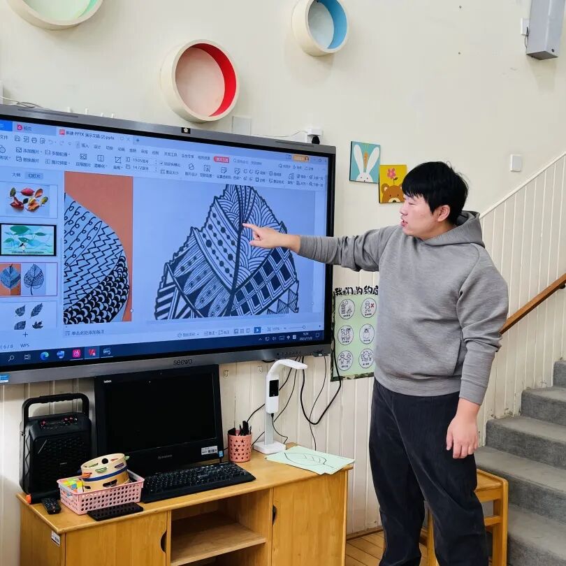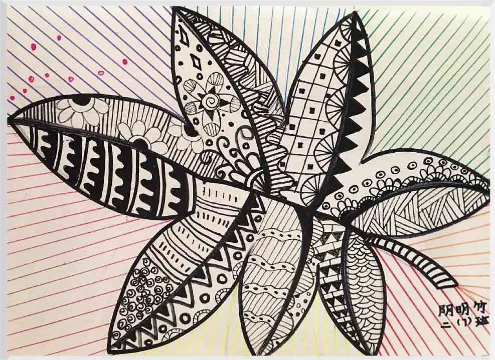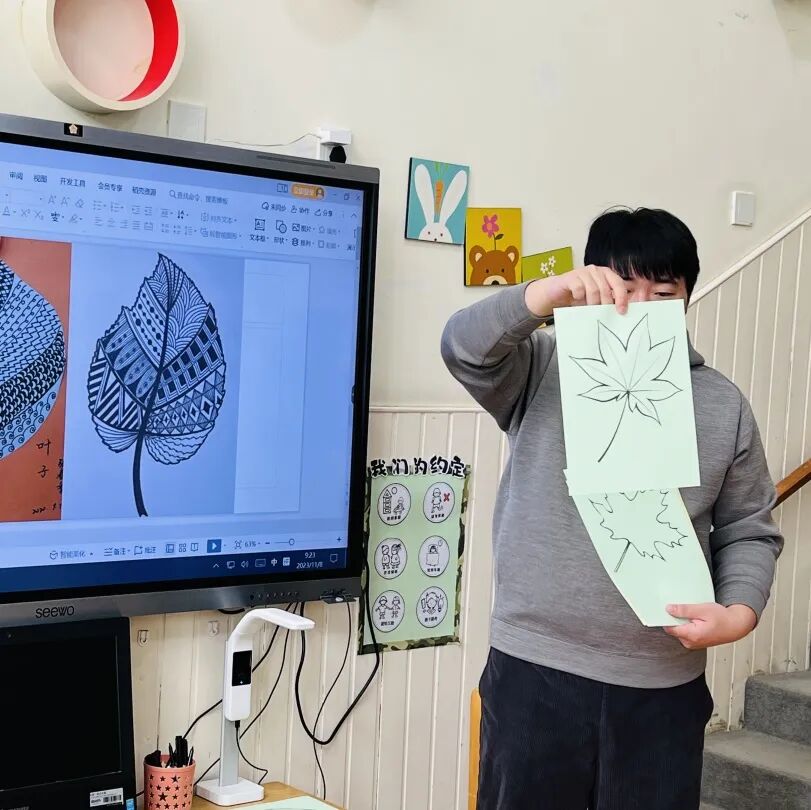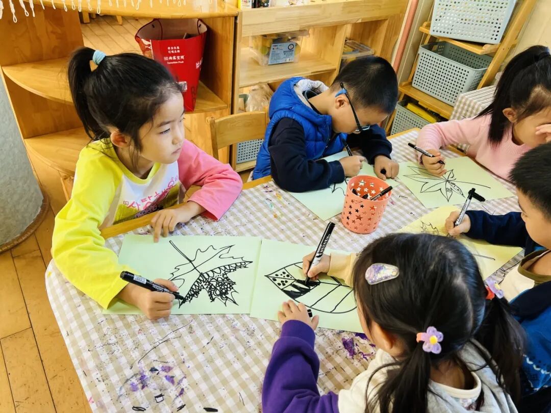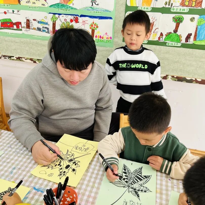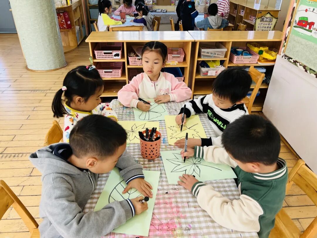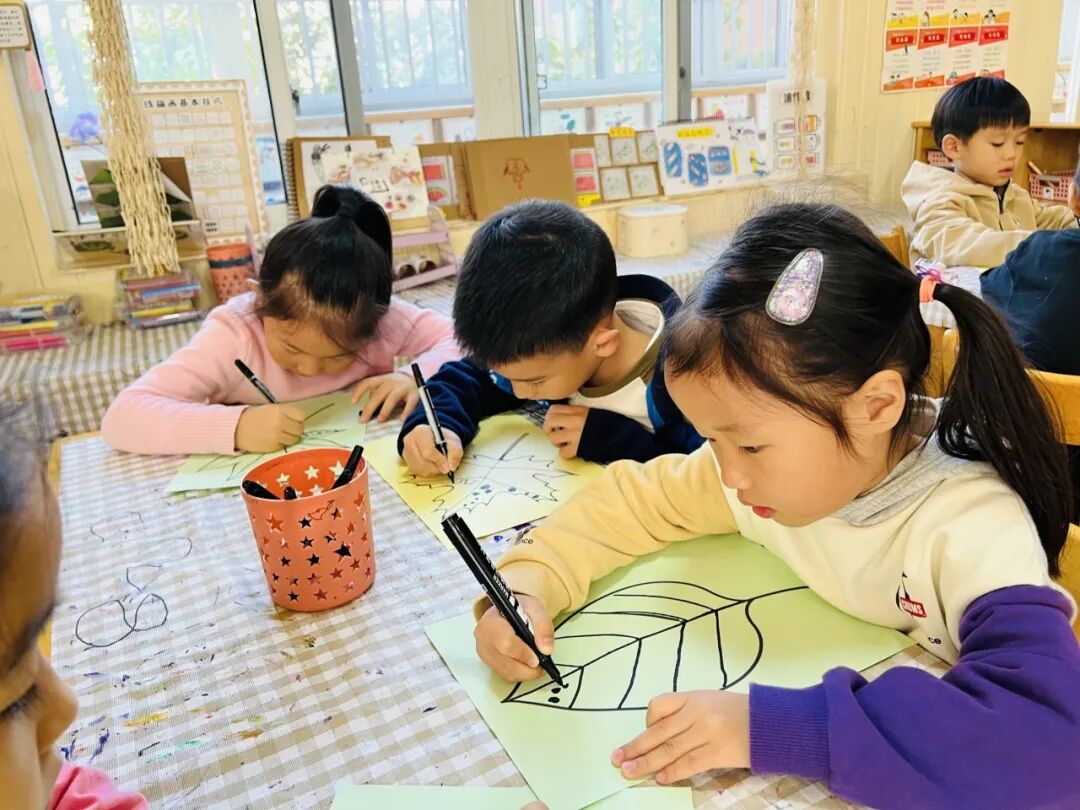 拿起小笔准备开始,孩子们在绘画的过程中运用了很多的线条和图形,有蚂蚁线、波浪线、锯齿线、直线;还有正方形、长方形、圆形、菱形、三角形、爱心、小花朵、小云朵等等。这些线条和形状在叶子里排列的整整齐齐,看起来真好看!