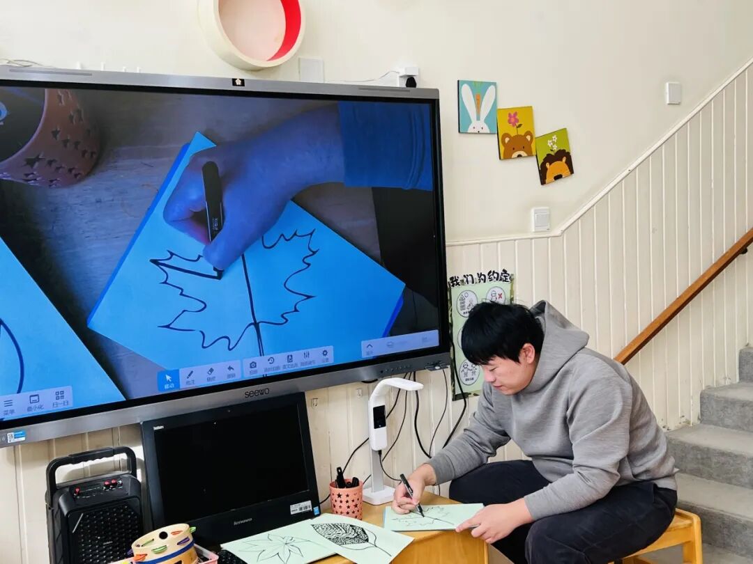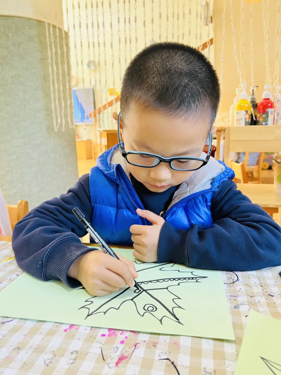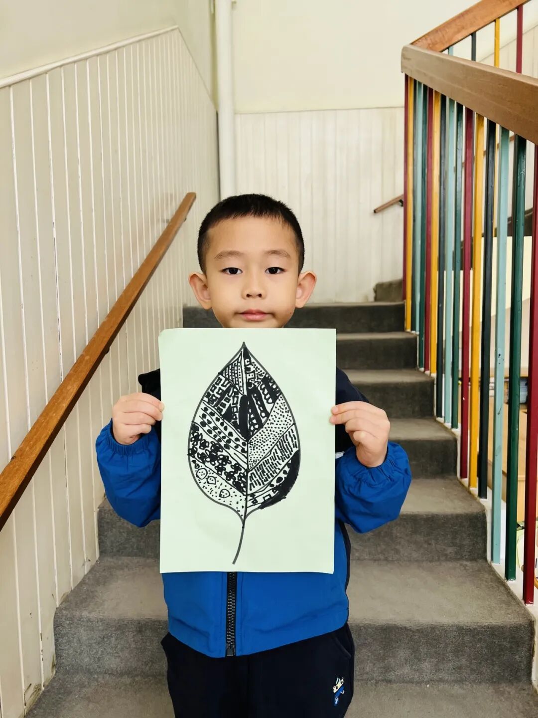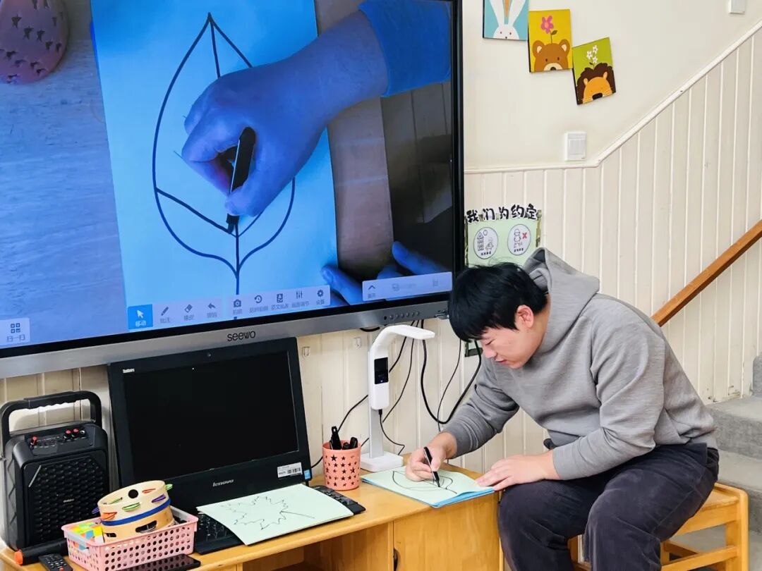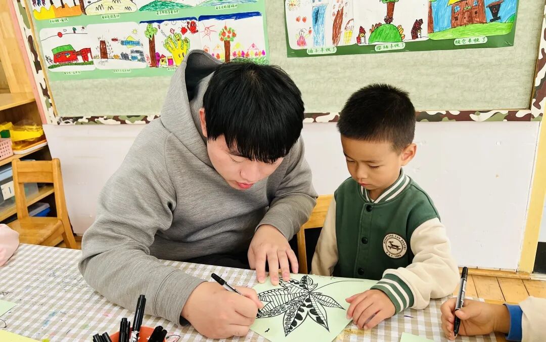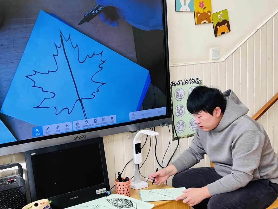 拿起小笔准备开始,孩子们在绘画的过程中运用了很多的线条和图形,有蚂蚁线、波浪线、锯齿线、直线;还有正方形、长方形、圆形、菱形、三角形、爱心、小花朵、小云朵等等。这些线条和形状在叶子里排列的整整齐齐,看起来真好看!