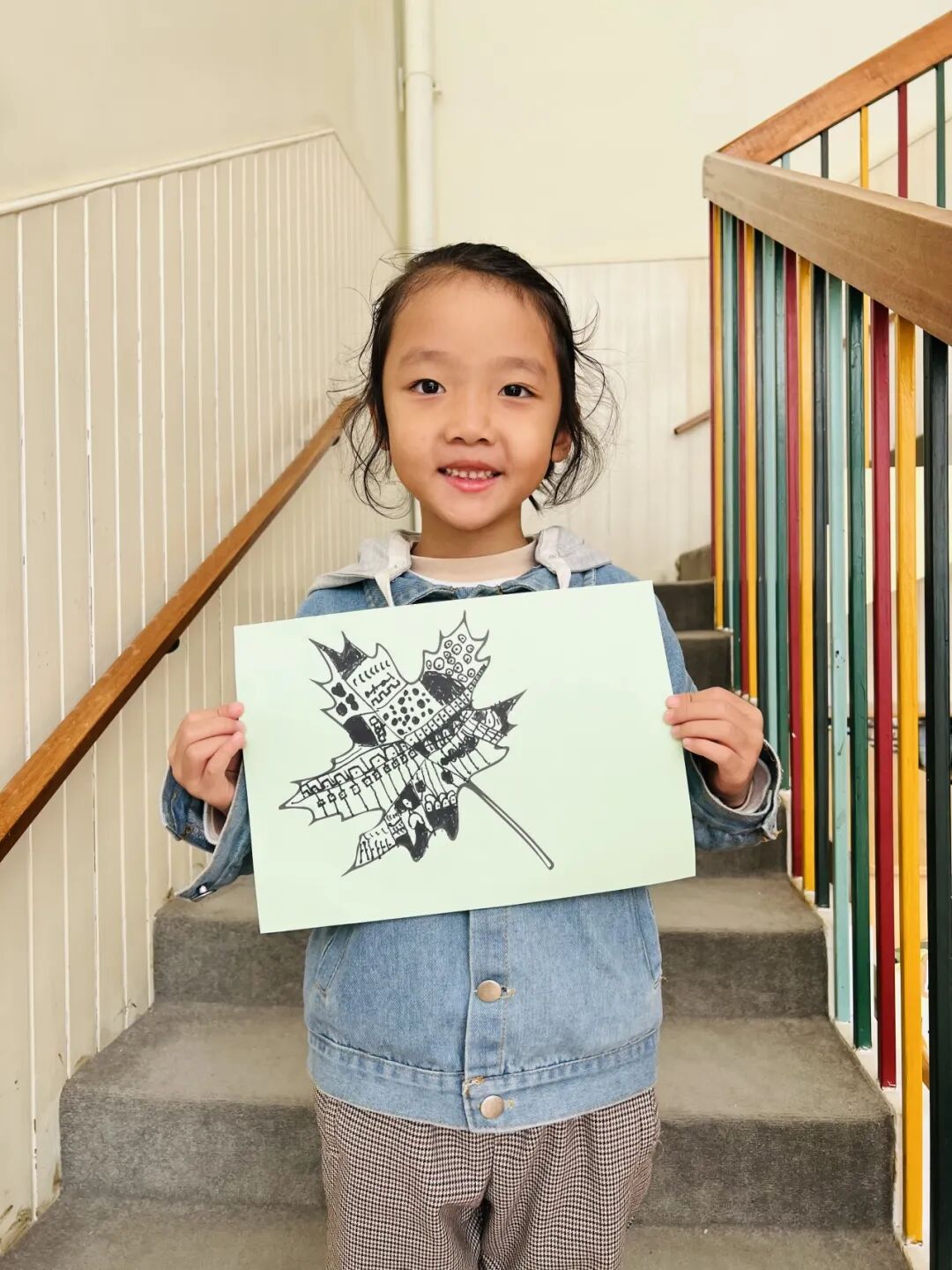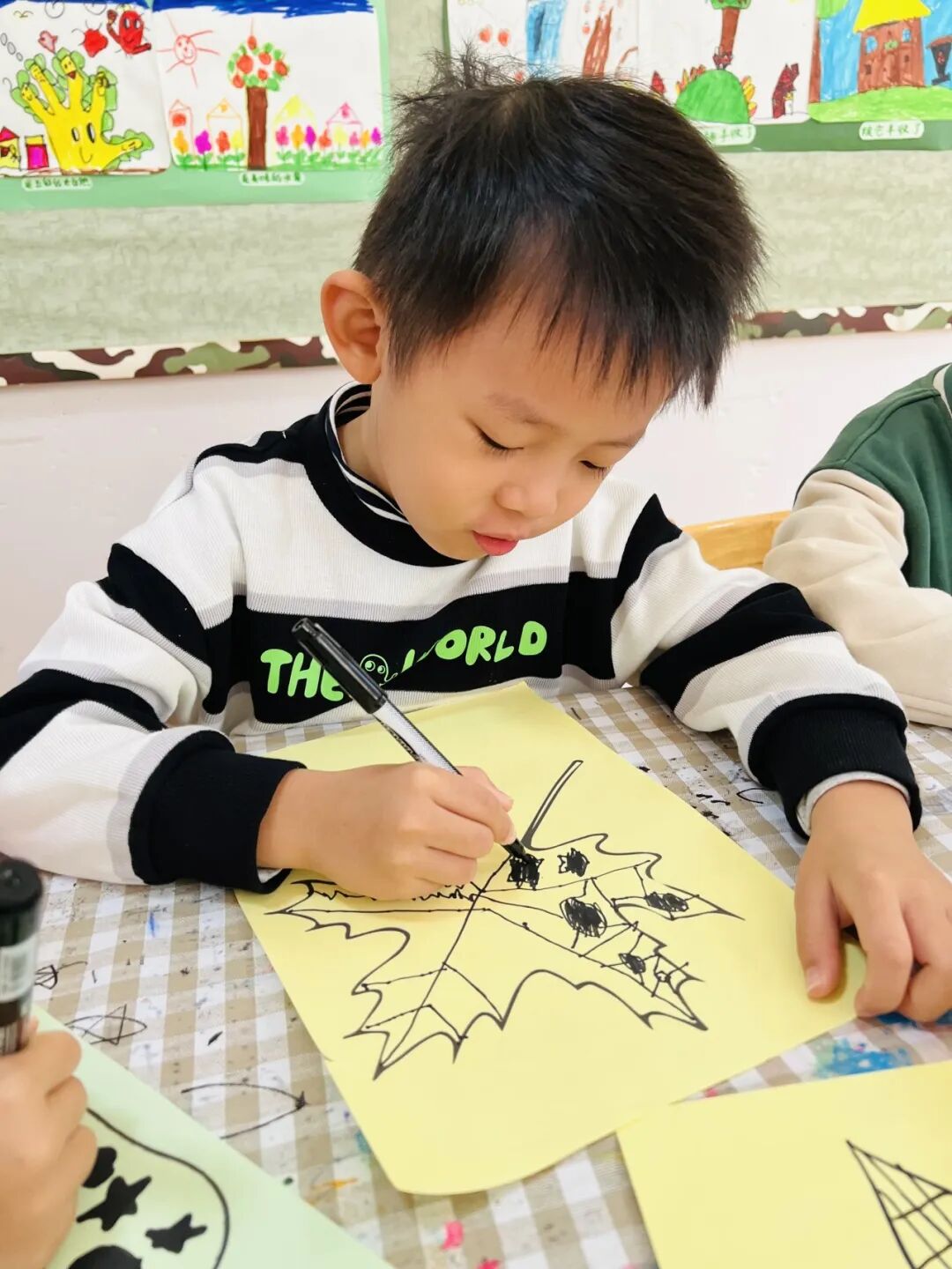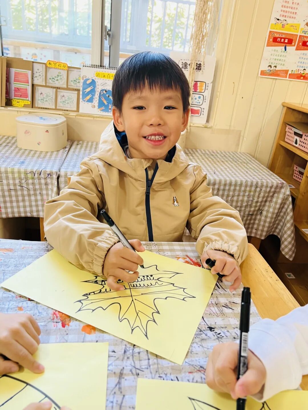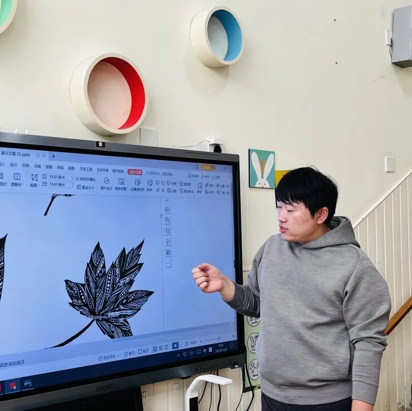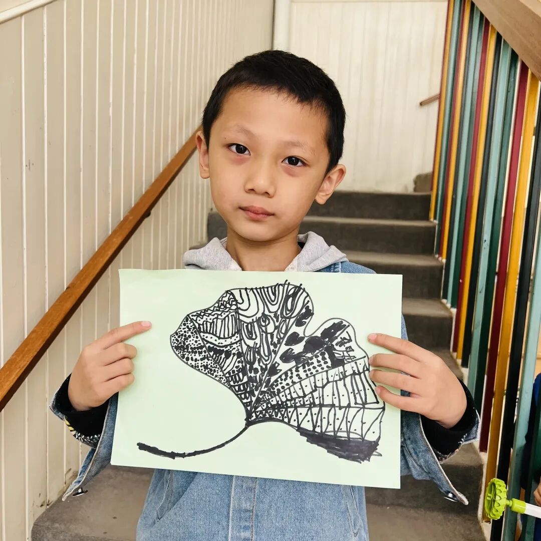 拿起小笔准备开始,孩子们在绘画的过程中运用了很多的线条和图形,有蚂蚁线、波浪线、锯齿线、直线;还有正方形、长方形、圆形、菱形、三角形、爱心、小花朵、小云朵等等。这些线条和形状在叶子里排列的整整齐齐,看起来真好看!