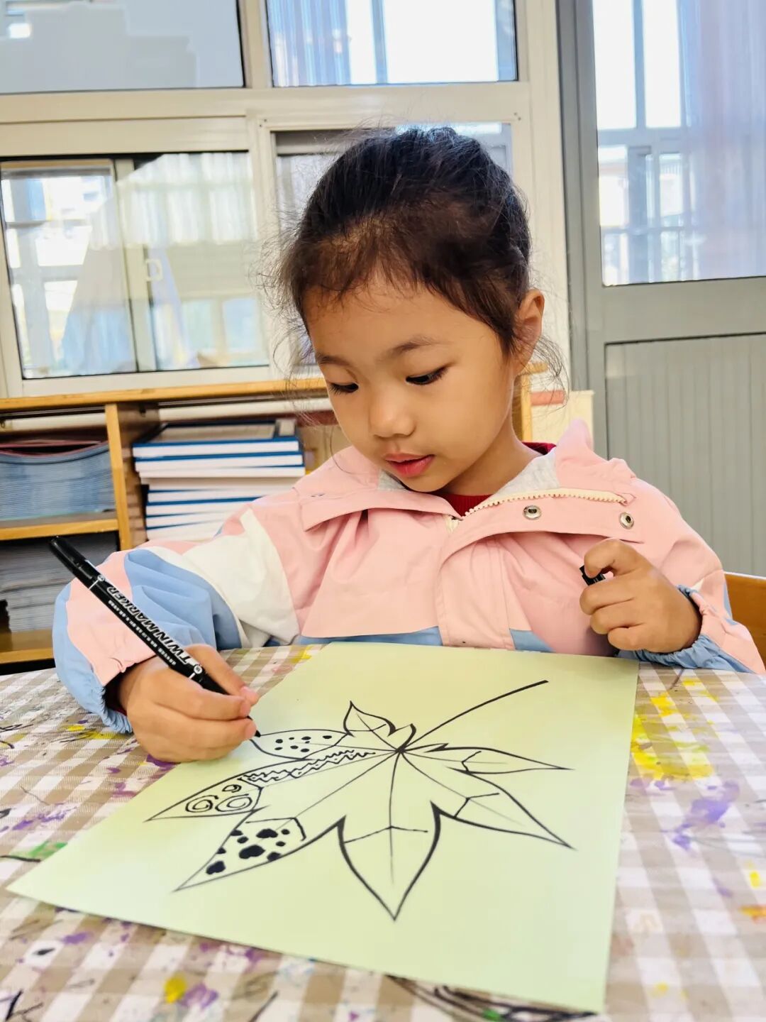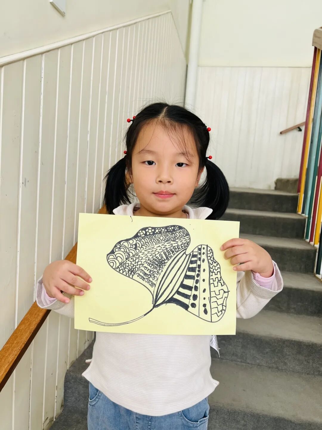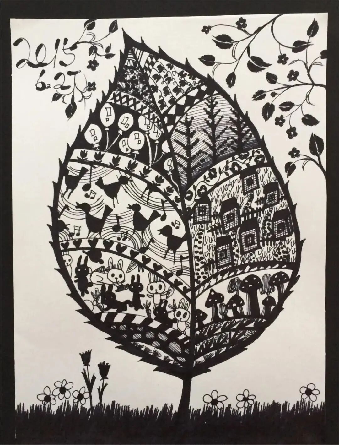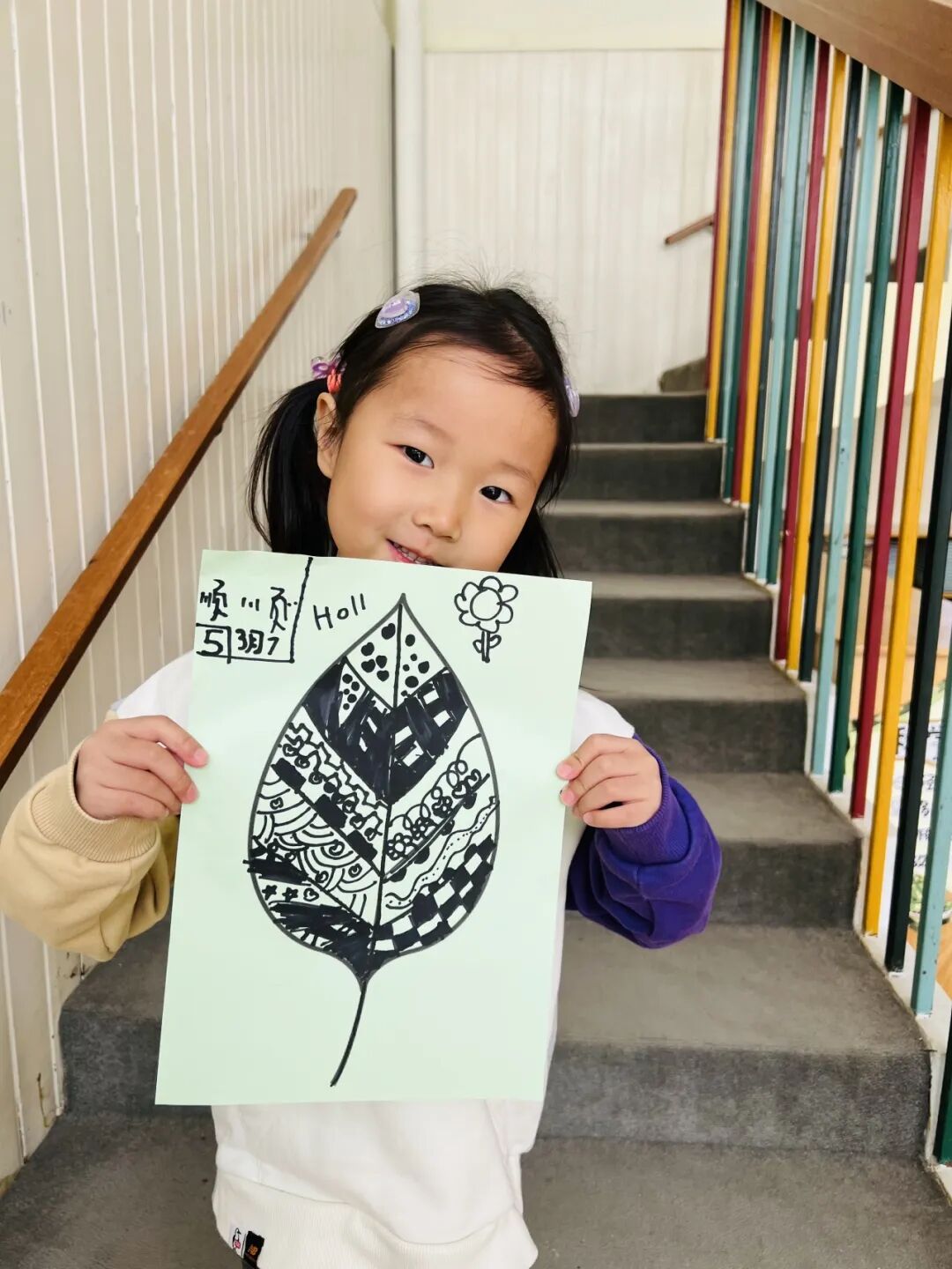 拿起小笔准备开始,孩子们在绘画的过程中运用了很多的线条和图形,有蚂蚁线、波浪线、锯齿线、直线;还有正方形、长方形、圆形、菱形、三角形、爱心、小花朵、小云朵等等。这些线条和形状在叶子里排列的整整齐齐,看起来真好看!