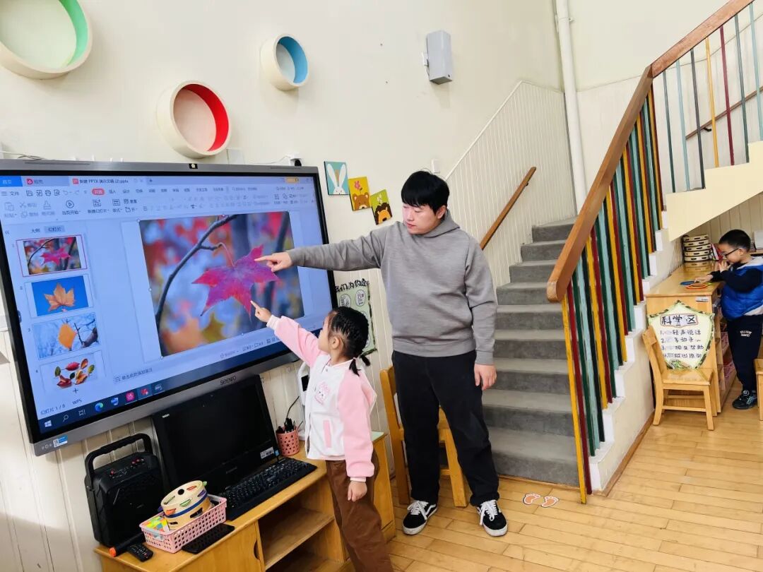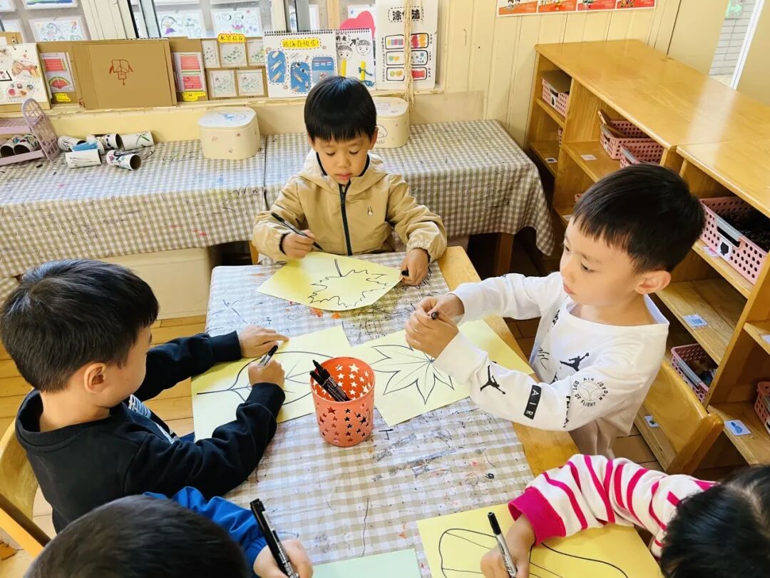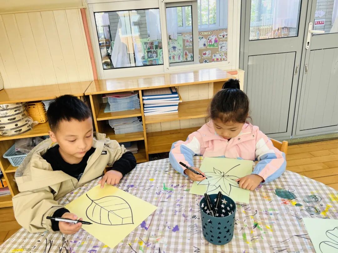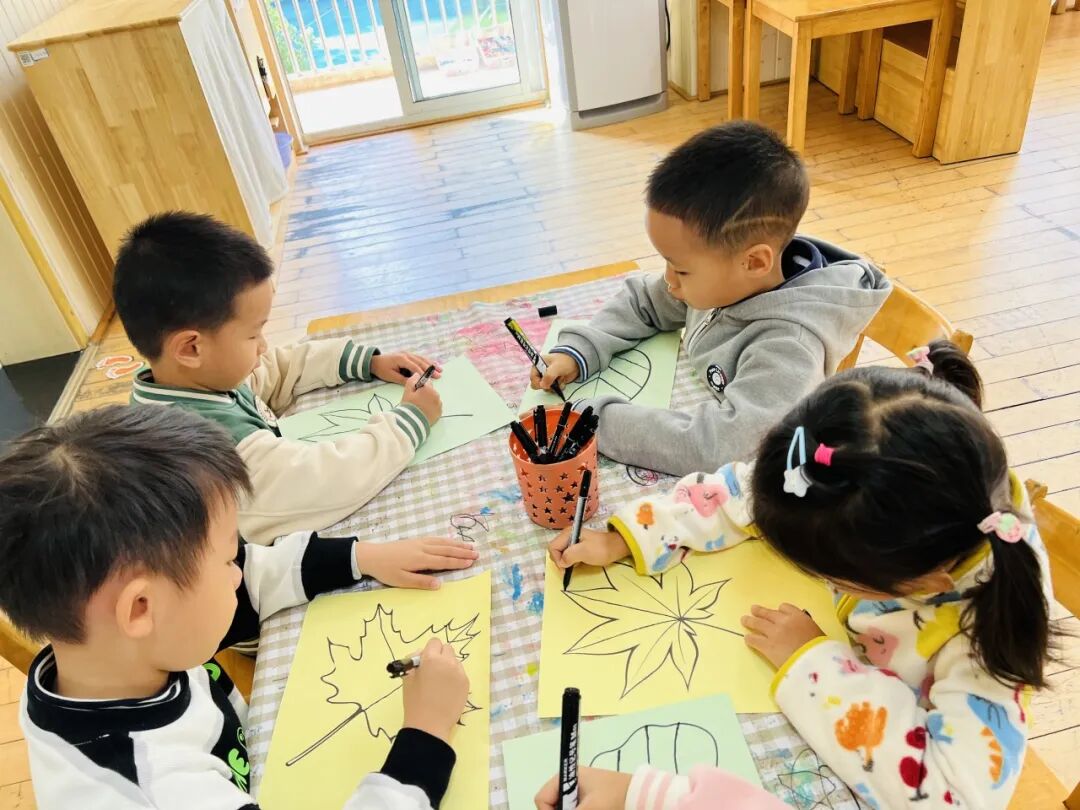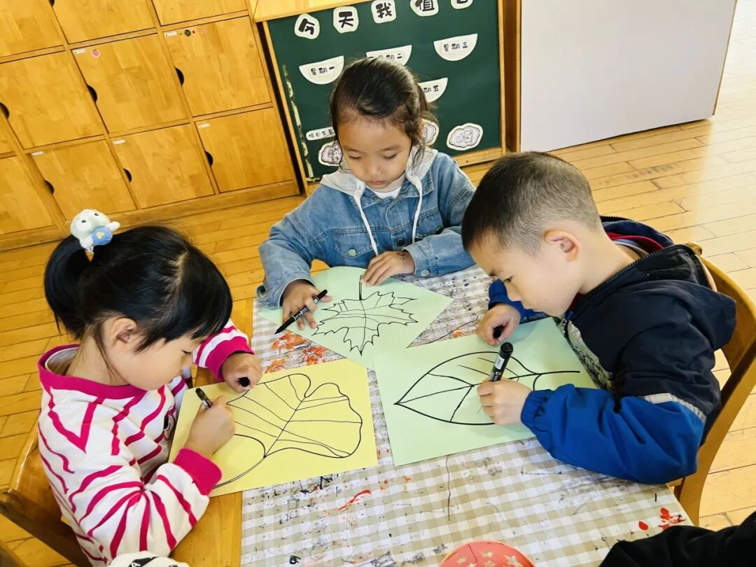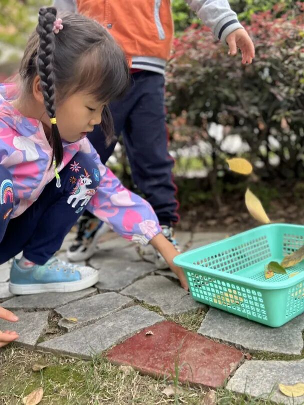 秋风瑟瑟,落叶纷飞,不同的树叶引起幼儿探索的欲望。