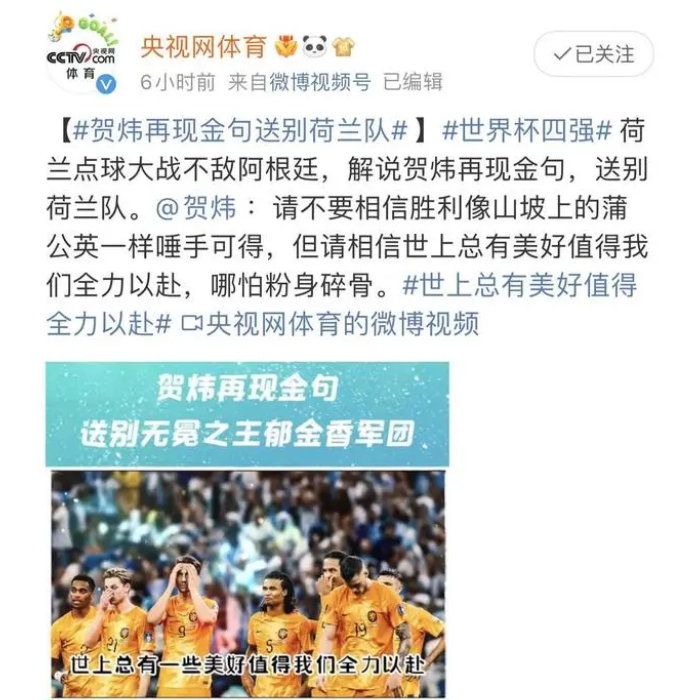 浩渺行无极,扬帆但信风! 虽然卡塔尔世界杯的赛场上缺少了中国男足的身影,但我们却拥有绝妙的足球解说——贺炜,接下来,跟着罗老师一起盘点,那些年惊艳我们的足球解说词吧~ 01 14年世界杯送别卫冕冠军西班牙队时的解说词 西班牙球员们尽管赢球但是心情依旧比较沮丧,但是他们完全不应为此感到抱歉。因为他们已经到过很多人永远无法企及的高度。 作为他们的球迷当然是得到满足还会想要更多的满足,这无可厚非,但是这种要求并不实际,因为自古打天下难,守天下更难,没有人可以永远站在顶峰。即使可以做到居安思危未雨绸缪,但是你身边全都是和你一样充满野心、充满激情和充满渴望的年轻人,他们可以把你的长处和短处放在显微镜下去研究,以你为标靶,你说守天下难不难? 人生当中成功只是一时的,失败却是主旋律,但是如何面对失败却把人分成了不同的样子。有的人会被失败击垮,有的人会不断爬起来继续向前,澳大利亚队是如此,西班牙队也是如此。我想真正的成熟应该并不是追求完美,而是直面自己的缺憾,这才是生活的本质。 罗曼-罗兰说过:“这个世界上只有一种真正的英雄主义,那就是认清生活的真相并且仍然热爱它。”西班牙队重头再来吧,难道向上攀爬的那条路不是比站在顶峰更令人热血澎湃吗?相信拉莫斯他们还有更多的机会,就是这样。观众朋友们,再见。 02 南非世界杯1/8决赛,贺炜再次奉献经典解说 胜负既分,结局也已经确定了,英格兰和德国永恒的对抗在世界杯历史上继续延续下去,历史的篇章这一段已经写完。我们想想吧,此时此刻在柏林、在慕尼黑、在汉堡、在科隆大教堂,肯定有无数的德国球迷为之欢欣鼓舞。而在伦敦、在利物浦、在曼彻斯特、在泰晤士河边的小酒馆,肯定有无数的英格兰球迷为之黯然神伤。 不过,让我内心感到无比欣慰的是,在生命如此有意义的时间节点,在今天晚上,电视机前的亿万球迷们能够一起来经历,共同分享。这是我的幸福,也是大家的幸福。我是贺炜,观众朋友们,再见! 03 2010南非世界杯1/4决赛,乌拉圭点球击败加纳 谁说这个世界是冰冷而残酷的?像乌拉圭人一样,只要你胸怀坚定的信仰,做好充分的准备,保持高昂的斗志,这个世界说不定就会揭开它冰冷的面纱,向你露出灿烂的微笑。 04 2008年欧洲杯,法国-意大利 对法国的队员来说,苏黎世的这个雨夜是让人伤心的,就像193年前在比利时的滑铁卢镇,拿破仑所面对的那个伤心的雨夜一样。 这个时候,我想起了法国文豪福楼拜的一句话:“我们在一生中最为辉煌的,并不是功成名就那一天,而是从悲叹和绝望中产生对人生挑战的欲望,并且勇敢迈向这种挑战的那一天。”我们用这句话和即将回家的法国队队员们共勉。让我们送别法国,祝贺意大利。 05 2018俄罗斯世界杯决赛,克罗地亚-法国 作为一个1991年才宣布独立的“年轻”国家,2018年俄罗斯世界杯,克罗地亚这个人口“小国”再次成为世界足球的焦点。在世界杯决赛中,他们2:4不敌法国队获得亚军。 这已经是克罗地亚人在世界杯上走过最远的旅程了,他们完全可以昂着头离开!这个人口只有400多万的小国家,在足球世界中创造了不可能,让我们亲眼见证了奇迹! 苏巴西奇(克罗地亚球员)很遗憾在哭泣,但是达利奇(克罗地亚队主教练)这个时候在安慰他的弟子们。达利奇面上基本没有什么表情,但这正是他的力量所在——胜,不妄喜;败,不惶妥;胸有激雷而面如平湖者,可拜上将军!(出自《史记》) 贺炜其他经典语录 06 足球是爱,而不是恨。支持你所喜欢的队伍,无论他在高峰还是低谷;欣赏你强大的对手,你正是因为他的存在而更强。这就是足球教给我们最大的哲理。 07 94年的时候,我还是个中学生,听到马拉多纳禁赛的消息,我当时认为马拉多纳有一天还会回来的。但是,生活当中往往就是这样,一件不经意的小事,经常就是命运的转折,一次看似普通的再见,其实就是永别!缘分就在那一个瞬间戛然而止。 08 足球就是如此,一方的欢喜衬托着另外一方的忧伤。人类的极端情感,在小小的绿茵场上,在90分钟的时间内,就能够得到充分的体现。这就是足球!这也是我们爱足球的原因! 09 每次的大赛,每年的联赛,就像是人生的一天一样,当一天结束的时候一定会有人开心,有人悲伤,但是无论如何,无论你是开心还是悲伤,明天都依然会来! 10 明天,中国足球第十次上路。纵使他只是堂吉诃德,我也愿做傻傻的桑丘。最深的爱,我想该是不弃不离。 11 中国足球即使是再多人的痰盂,也永远是我的圣杯。 12 人类情绪当中的最高昂的情绪和最低落的情绪交相辉映而成,也许只有在失利者的落寞陪伴之下,胜利者才感觉得到幸福的滋味,而我们旁观的球迷,在这样的情感交织当中,终于体会到了活着的意义。 13 爱本并没有错,爱谁都是自由,爱强者更是人类的天性。不过因为自己所爱的事物强大,就幻想自己也强大了,甚至觉得爱其他事物的人都已经被踩在脚下了,这就是病态,一种弱者的病态。此道理,适合所有人。 14 深感当下中国最危险的对立,不是富与贫,不是左与右,不是庙堂与江湖,而是有底线与无底线,有信仰与无信仰,有共识与无共识之间的对立。因所处社会地位不同而作出不同选择可以理解,但底线、信仰和共识则是不分贫富左右官民均赖以生存的公约数。毁之则众人互害,保之则多元并存。 今天小编为大家整理了他在