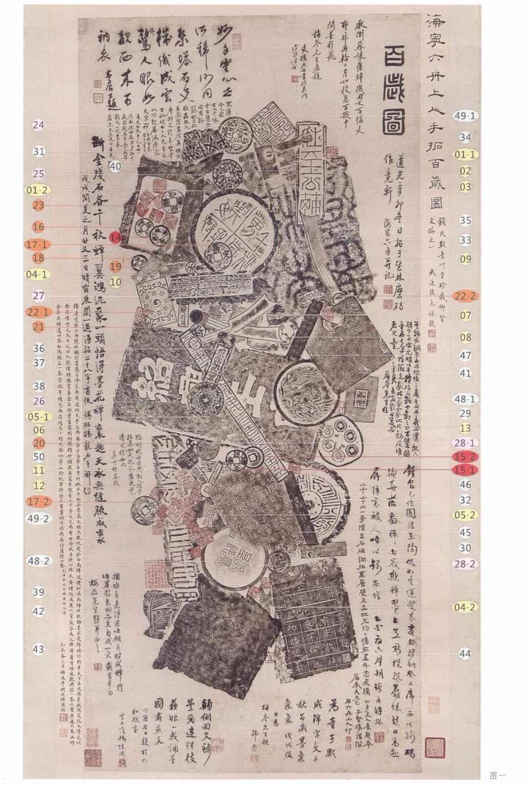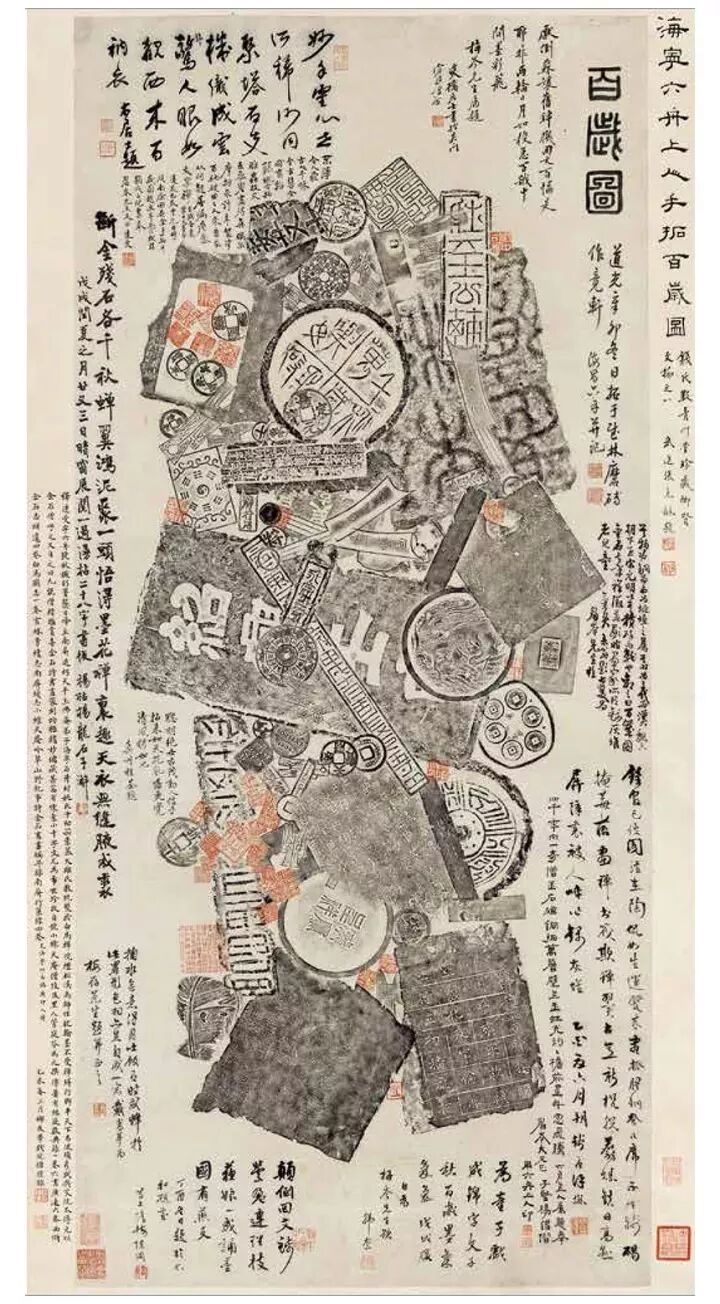 六舟自述在道光十二年(1832),即42岁那年“是秋寓斋多暇,以所藏金石小品,效钱舜举锦灰堆法拓成立轴,名曰百岁图,凡二十余幅,又曰百岁祝寿图。嗣因慈师松溪老人大衍之庆,又叙千种名曰千岁图,阮文达公为之跋,一时题者边幅皆盈,以为创金石家所未有”[27]。