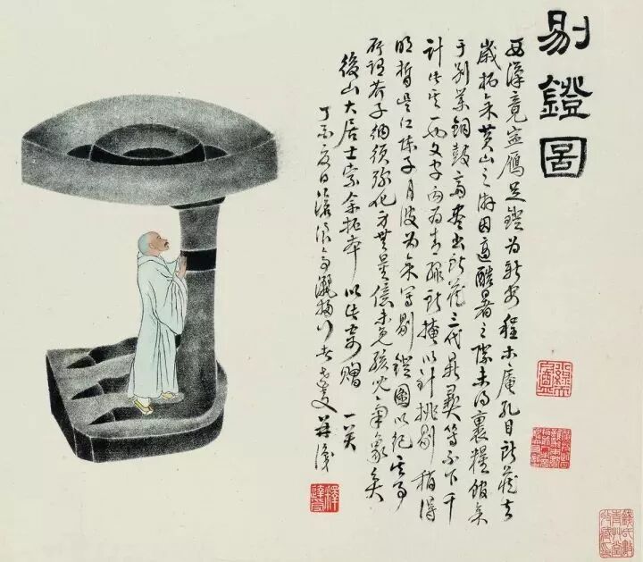 在他的右边,即画幅的最右下端,是“锺官己佚图经在,陶侃如生运甓来。尽拾腥铜登几席,不令残碣掩莓苔。画禅书筏欺蝉翼,古意新机脱麝煤。镇日高悬屏障里,被人呼作锦灰堆。乙酉夏六月朔,钱塘徐楙[24]”。白文“问遽庐”印。