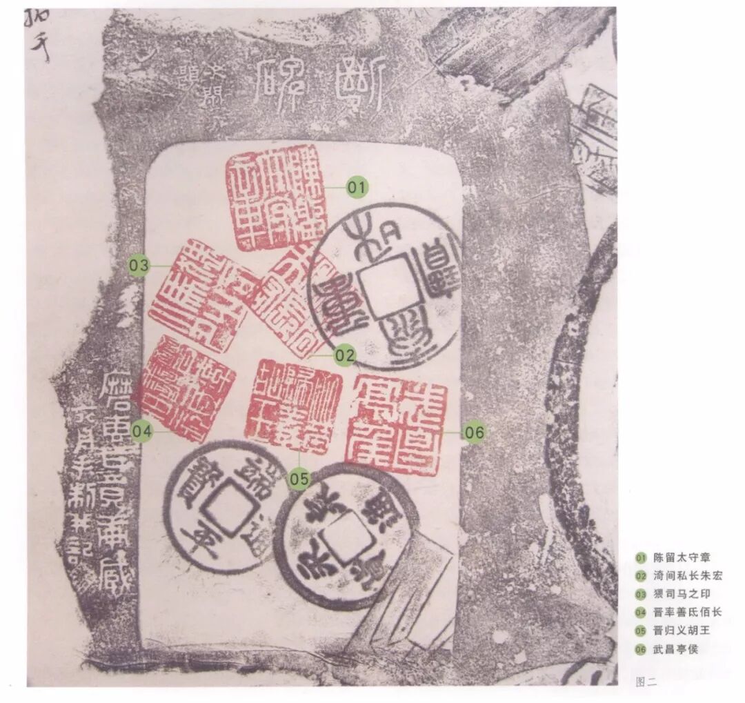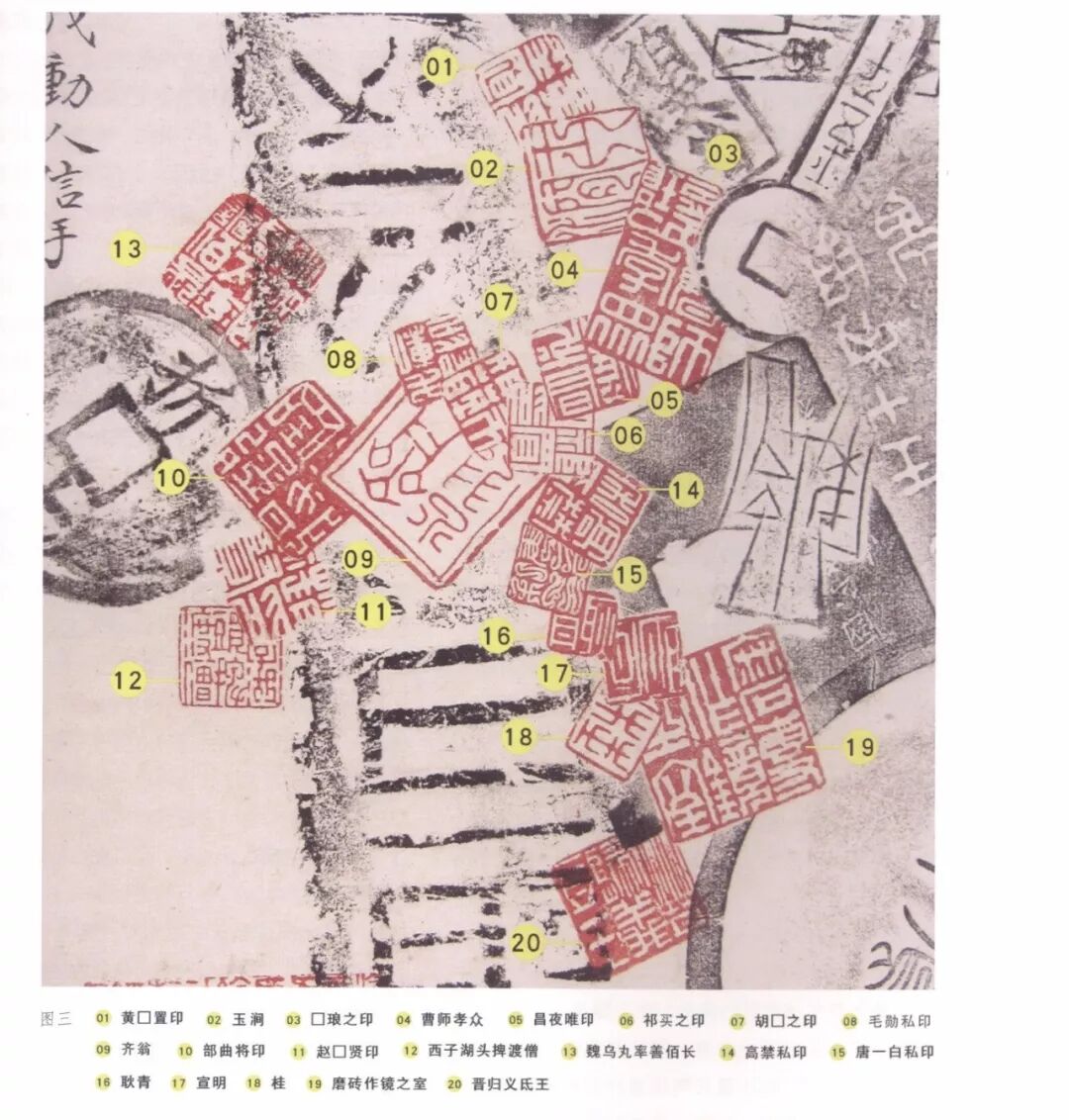 图中所见的印章大多为汉晋古印,见图二、图三中所标。朱简在《印经》中的这段话,不但提供给今人一个识别古印的标准,也很好地解释了六舟为何会选择收藏唐之前的印章:“余谓上古印为佩服之章故极小。汉、晋官印大仅方寸,私印不逮其半。所见出土铜印璞,极小而文极圆劲,有识、有不识者,先秦以上印也;璞稍大而文方简者,汉,晋印也;璞渐大而方圆不类,文则柔软无骨,元印也;大过寸余,而文或盘曲,或奇诡者,定是明印。嗟夫!成风罕操,金莫刮,敢向人前津津秦、汉,正如学究谈诗,出口盛唐。”[19]正因为“印于商、周、秦,盛于汉,滥于六朝,而沦于唐、宋”[20]。印学史上的第二次高峰,则是伴随着宋代金石学兴起而出现的收藏古印、集辑玺印谱录的风气下催生的文人篆刻,在复兴汉印艺术的口号下,于清代出现。