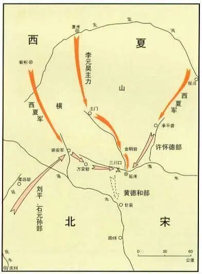 先来说说三川口之战的简略情况吧。三川口之战是宋和夏的头一遭正面大战。西夏军队先是连吃了两个败仗。西夏皇帝李元昊醒过神来,发现北宋军队并不容易对付。于是开始使用诡计。他挑选了容易突破的金明寨下手开始作战。当时这里的守将李士彬贪暴愚顽,部下怨声载道,这里的知州范雍怯懦无谋,李元昊开始用各种计谋如反间计、诈降等,终于得手。李士彬被杀,范雍意欲求和投降,被部下严词拒绝,不得已备战拒敌。