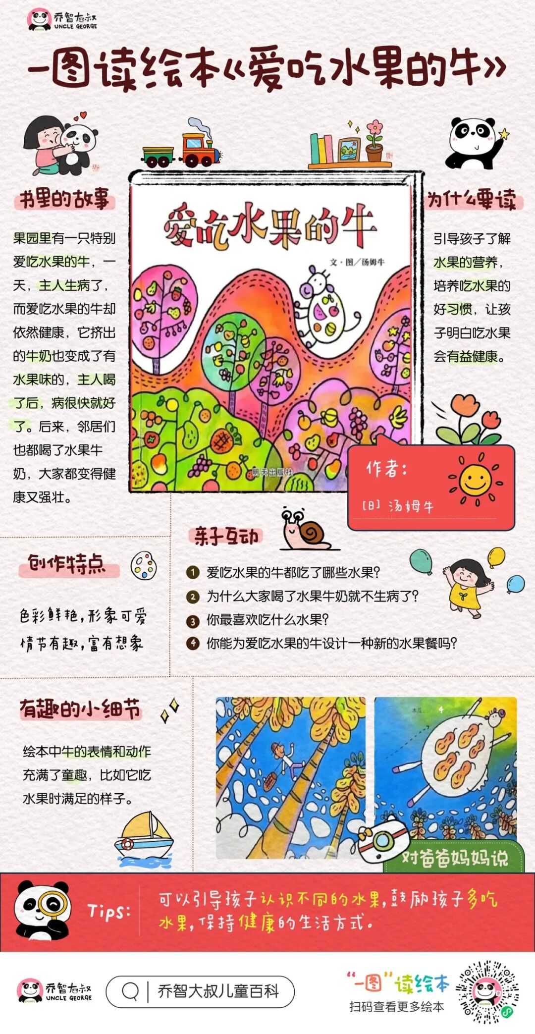 《爱吃水果的牛》是一本充满温暖和智慧的绘本,它以生动有趣的故事和精美的插图,向孩子们传达了健康饮食、关爱他人和解决问题的重要意义。在亲子共读的过程中,家长可以和孩子一起分享这个美好的故事,引导他们养成良好的生活习惯,培养他们的爱心和创造力。