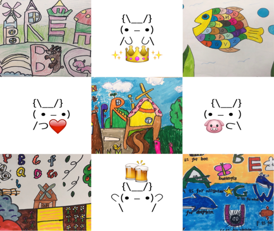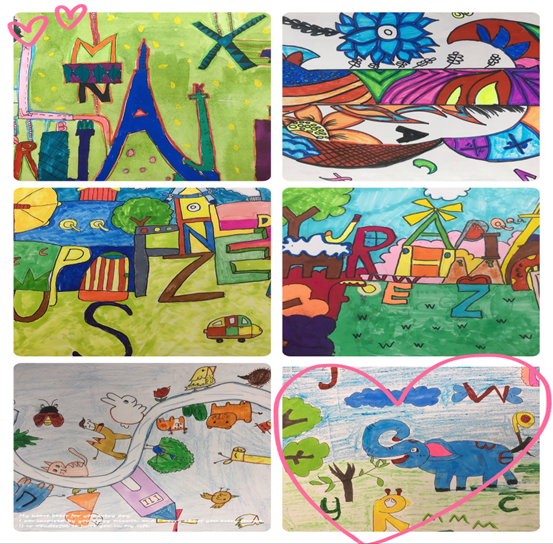 这一幅幅充满设计感的创意作品,拼凑起来就是一个大的视觉盛宴。通过字母创意画大赛,不仅让孩子对英语书写形成初步感知,也激发了孩子们的英语学习兴趣,更让孩子领会了简单的事物也隐藏着创意感。