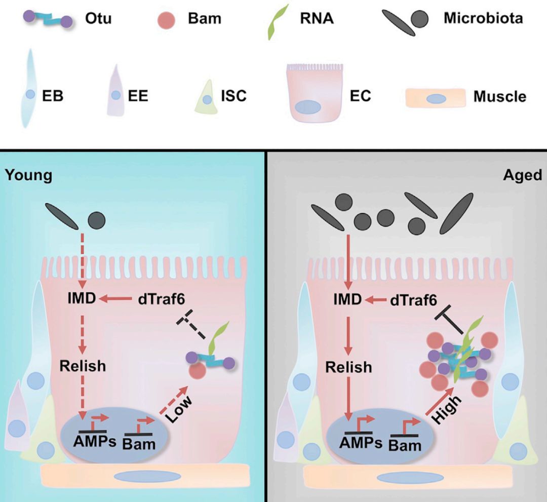 体内Otu的“自我聚集”行为和酶活是一个可调控过程。分子伴侣蛋白Bam与Otu蛋白形成复合物,促进Otu聚集,增强其去泛素化酶活性,协助参与对免疫信号及寿命的调节。同时Bam的表达随年龄的增长呈动态性变化,在果蝇成长和衰老过程中,Bam的动态变化影响并调节了Otu的活性,从而调节果蝇寿命。机制上,Bam/Otu复合物靶向IMD信号通路重要因子dTraf6,影响其K63位泛素链的切割。Otu/Bam/dTraf6三者形成可调节的“反馈轴”,在果蝇衰老过程中动态调控IMD免疫信号通路,影响果蝇肠道的屏障及稳态,进而影响果蝇寿命。