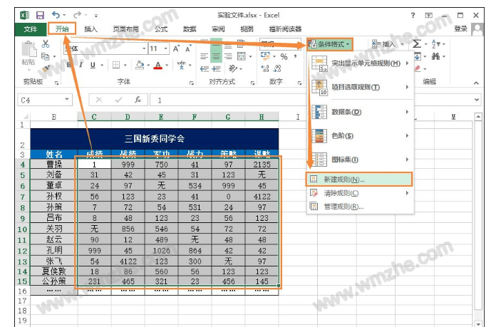 1、选择需要计算高于数值的区域,再点击“开始”→“条件格式”→“新建规则”。