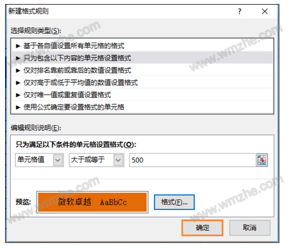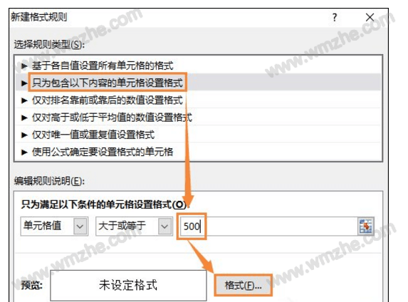 2、打开新建格式规则窗口后,点击“只为包含以下内容的单元格设置格式”→选择条件“大于或等于”:500 然后点击格式。