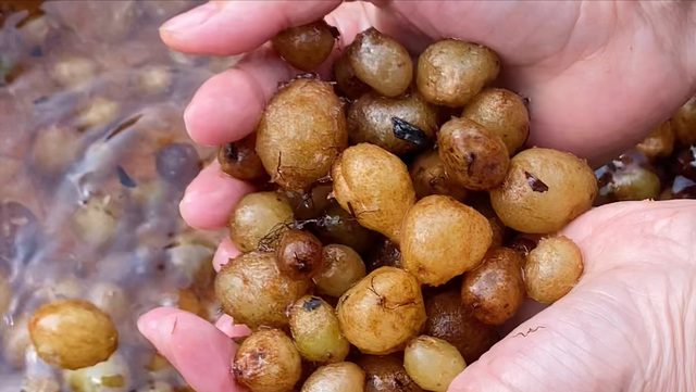 它的果实结的还是蛮浅的,我们扒开它的叶子都可以看到它的果实,他的果实我们把泥土洗干净,剥开它里面看起来是白白的,晶莹剔透,像珍珠一样。这样就可以直接生吃了,还可以用来煲汤煲排骨吃。