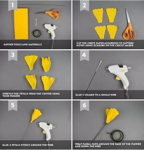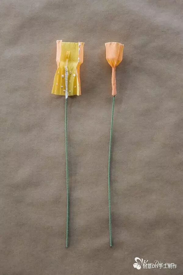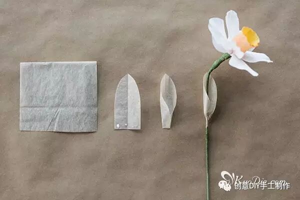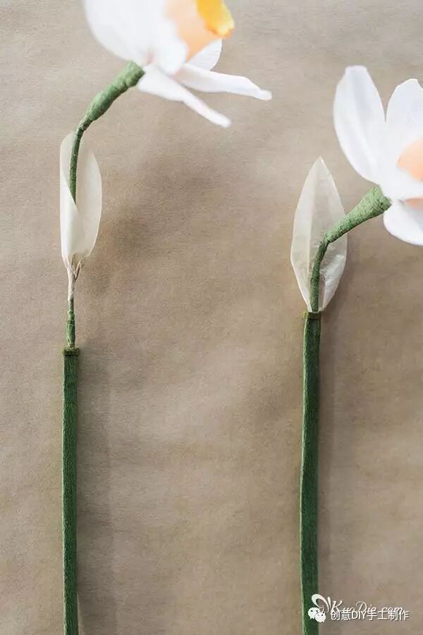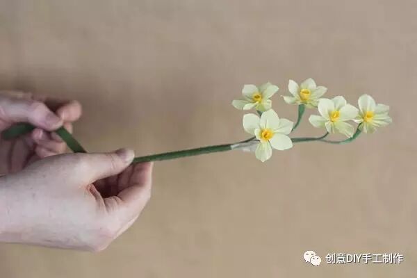 步骤7:纸花怎么做伞形花序:可以使用20#花茎线按最小的模板制作出很小的水仙花朵,并添加上一片佛焰苞,将3-7朵合并制作成花序