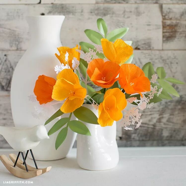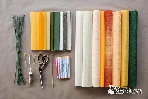 30-60g细皱纹纸(米色或金黄色)、160-180g加厚皱纹纸(白色,奶白色,淡粉色、杏黄,橙色渐变或桔黄色、肉色、黄色、橄榄绿色)、米色半透明包装纸、手工白胶、剪纸专用剪刀、45cm长纸包花茎线(18#、20#)、黄色或橙色花蕊、竹签、圆柱形物品(铅笔、记号笔、指甲油瓶,唇膏管,在这里使用手工白胶瓶子代替)、橙色马克笔