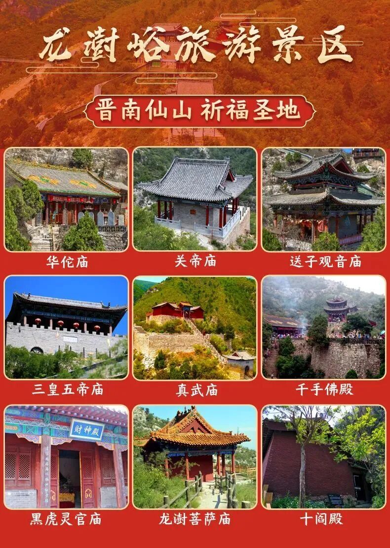 千手佛殿华佗庙初建于唐。宋太祖当年征战此地突生恶疾,幸得华佗显圣方才痊愈。赵匡胤念其恩,令重修庙宇,御笔亲书《汉宗医华大夫》牌位至今犹存。因其灵验,求医问药者摩肩接踵,华佗庙凌驾于深壑之上,无礅、无柱、无石,全体为木结构,悬空而起,堪称建筑奇观。千手佛殿始建于宋朝,后多次重建及修缮。千手佛是佛祖的化身,有千眼洞察人事秋毫,有千手铲除人间不平,两旁文殊、普贤两位菩萨慈眉善眼,下有罗汉形态各异。送子观音庙建于元末明初。据说来这里祈求子嗣的十之八九心想事成,但需求子的妇女傍晚和清晨亲自上香才能得偿所愿,多子多福。上世纪60年代曾遭毁损,现今翻修如故。黑虎灵官庙修建于明朝,后多加修缮,保存完好。黑虎灵官赵公元帅掌管天下一切财富,迎祥纳福,除病减灾,买卖求财,事皆圆满,令福寿绵绵。龙澍峪景区乃洞天福地,眼前百福满壁,无意争春,却福至四方。真武庙建于唐初,明万历七年重加修缮。攀援而上的石阶为千年古道,阅尽岁月沧桑。石阶共365级,暗喻一年365天祥瑞扑面。真武庙道院坐北向南,地势险峻,青瓦红砖,雕花刻纹,脊踞瑞兽,伟岸森严。仰众山蒙蒙横卧,俯脚下白云缭绕,犹如置身于九天宫阙。三皇庙是龙澍峪的最早庙宇,相传始建于唐朝。整个建筑群落顺山势三层排列,上层五间供奉人类始祖神农氏、伏羲氏和有巢氏,下层南北厢房两间供奉历代帝王之牌位,从传说中的三皇五帝到清光绪而一统。北顶与南顶遥相呼应,登高俯瞰,龙澍峪风光一览无余。关帝庙始建于宋朝。关羽,山西生人,三国时期蜀国大将,为忠义典范,与后人尊称的“文圣人”孔夫子齐名,被人们称之为武圣关公。关公之像红面长髯,侠肝义胆,忠勇无畏。龙澍菩萨庙重修于明朝。龙澍菩萨与龙澍峪缘分颇深,曾降服水火二龙,护佑四方百姓安康,并在此广弘佛法,所度之人不可称数。人们为感念龙澍菩萨,将龙斗峪改为龙澍峪。从北大街出发,沿北大街(大运高速襄汾连接线)→左转进入襄台线→(京安路口)右转进入临夏线,沿景区路标到龙澍峪{高速}驶入后→吉县/宜川/壶口瀑布G22→青兰高速→南辛店/汾城S232出口,在南辛店下高速左转,沿景区路标到龙澍峪{太原、临汾高速}:驶入高速→临汾/太原方向G5→吉县/宜川/壶口瀑布/G22→青兰高速→南辛店/汾城/S232出口,在南辛店下高速左转,沿景区路标到龙澍峪{临汾低速} 尧庙往金殿方向进入临夏线,在河北路口往西,途经浪泉、薛村,沿景区路标到龙澍峪(行车时间大约40分钟)驶入高速→吉县/宜川/壶口瀑布G22→青兰高速G22→南辛店/汾城S232出口,在南辛店下高速左转,沿景区路标到龙澍峪驶入高速→沿侯平高速公路S75→京昆高速公路G5→(转)吉县/宜川/壶口瀑布G22→青兰高速G22→南辛店/汾城/S232出口,在南辛店下高速左转,沿景区路标到龙澍峪驶入高速→侯马方向→侯平高速公路S75→京昆高速公路G5→吉县/宜川/壶口瀑布→青兰高速G22→南辛店/汾城/S232出口,在南辛店下高速左转,沿景区路标到龙澍峪临汾乘车推荐: 临汾-黄崖村公共汽车始发于尧庙汽车站,默认到黄崖村为终点(要来龙澍峪的游客要向司机师傅说明哦,可以送到景区停车场)。你们可以打电话提前咨询发车时间和行车路线,说不定会路过你家小区哦。公共汽车联系方式:13620689985或13133186960襄汾乘车推荐: 襄汾-黄崖村公共汽车始发于襄汾汽车站,联系方式:13834349168