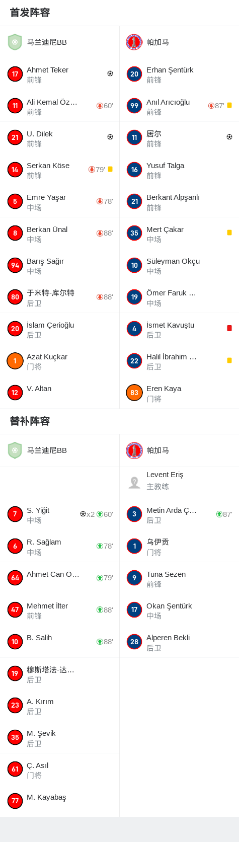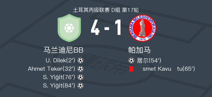 并未因此改变。马兰迪尼BB的S. Yi?it在比赛中表现出色,接连两次攻破对方球门,完成梅开二度。帕加马的?smet Kavu?tu因红牌被罚下场,使得球队在场上处于不利局面。最终,马兰迪尼BB以4-1的比分战胜帕加马,取得了一场精彩的胜利。
