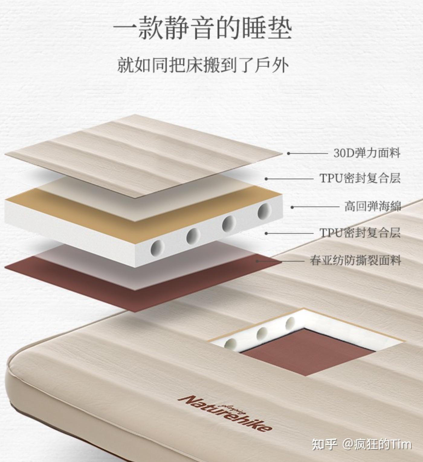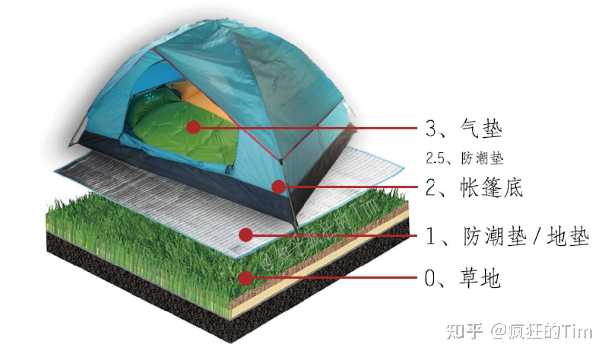 户外露营,似乎是这几年年轻人非常喜欢的活动,亲近自然,山水之间享受半日宁静,确实非常惬意。垫子的选择,是影响户外露营舒适性的重要装备,关于垫子,网上充斥着一大堆不同的叫法:防潮垫、地垫、地席、气垫床……垫子与垫子分工不同,作用不同 多年露营爱好者,就依据自己趟过的坑,来说说干货,这到底怎么选,我 希望借助这篇文章进行详细解答,尽可能保证各位看完即会,不走弯路。 以下根据个人多年露营经验全文手敲,如有雷同就是抄袭我疯狂的Tim的,拒绝洗稿。 一个完整的露营“住所”应该包含哪些 从地面开始从下往上数,可以分为4层,根据自己情况调整为3层: 依次为:地垫/地布—>帐篷底布—>防潮垫—>睡垫。 话说,还有一种垫子叫野餐垫,这个和帐篷关系不大,后面再说。 第一层:地垫、地席、地布或防潮垫 这一层的主要作用有三个:防止帐篷底布被地面杂物划破;防止地面水汽进入帐篷;避免弄脏帐篷底布,毕竟细地垫总比洗帐篷要简单很多。如果地垫的防潮功能很好,第三层的防潮垫就可以省去。 第二层:帐篷底布(更新一下排除歧义,帐篷底布是指帐篷的底,也就是帐篷最下面的一块布,并不需要特别的单独购买帐篷底布) 第三层:防潮垫 如果第一层只使用了地垫,防潮能力不够或者没有使用防潮垫,建议在帐篷里面再加一层防潮垫。 第四层:睡垫 睡垫的核心作用是睡着舒服,不会被地面杂物或小石子硌得慌。网上一大堆文章把睡垫说成防潮垫,还一本正经的说防潮垫要放在帐篷里面,至少从我的多年露营经验来看,防潮垫放帐篷里面不是一个好的选择。 如何选择防潮垫、地垫、睡垫 1、地垫、地布 地垫,建议选用牛津布材质,耐磨,不易损坏,同时也很轻便,建议买质量好一点的,四个角有金属孔的,在不需要地布铺在帐篷下面的时候可以将地布作为遮阳天幕使用。 地垫地布除开一些买帐篷时送的,市场选择后基本就三个品牌:捷昇、wellhouse、牧高笛,这从某东的销量就可以看出来,另外捷昇和wellhouse的地垫从各个方面参数看都像是一家工厂代工的。 2、防潮垫 建议购买最简单最便宜的防潮垫,轻便防潮为主,我自己常用的就是铝薄的,非常轻,也好打理,水一冲就干净了。但实话实说铝薄的很容易被划破口子,但是没关系,便宜嘛,坏了再换。 还有一种就是高弹泡沫的防潮垫,价格就贵一些了,类似于瑜伽垫上加了一层铝薄,不过有睡垫的情况下没必要再用这种加厚的 3、睡垫 这才是真的“床垫”,睡觉舒适性的用品,基本就四种可选:自充气单人、自充气双人、气垫床、蛋槽高弹乳胶垫。 时间不长的露营需求,建议用自充气垫,单人自充气垫两侧都有扣子,可以多个拼接在一起使用。虽然拼接处有几厘米的“低洼地带”,但影响不大。 下面这款牧高笛的蛋槽高弹垫值得推荐,注意这款是放在帐篷里面的,使用的时候建议同时在帐篷下面单独加铝箔防潮垫。这一款有大约2cm厚,特点就是轻,一整块也就0.5kg,收纳后比较规整,不占空间。 除了气垫床,下面这个是最推荐了的 性价比很高 蛋槽垫子是最适合轻量化露营、徒步露营的垫子,核心就是重量轻+使用简单。 论舒适性,肯定是气垫床,不过需要充气,有充电式的电动充气工具,也有脚踩的,建议电动的,脚踩真的很累。intex的气垫,是我自己在用的,质量非常好,某东超5万的销量不是儿戏,气垫的质量比想象的要好很多,我 用了这么多年也没出现漏气的情况,关于漏气一定要把卡口卡紧。 一定要注意与自己的帐篷尺寸保持一致!!!打气时之前一定要先将气垫放入帐篷中,充满后放不进去,别问我为什么知道! 一分钱一分货,还有一个比气垫床更舒服的,就算放在家里床上也是一个非常不错的床垫 4、野餐垫 野餐垫估计用过的人很多,这个其实和帐篷里外的垫子没啥关系。野餐垫的选择一般参考下面几个指标: 好看,漂亮,防潮,建议购买一面是牛津布一面是绒布的垫子,防潮又舒适 好清洗,野餐之旅结束,垫子上多多少少会沾染一些污渍,很影响下一次野餐的性质,所以最好能直接放入洗衣机里清洗。 之前分享过大量关于露营装备选择的经验,且获得了知友们的认可,以下是目录 欢迎点赞收藏,关注我会收到不定期更新更多关于露营的小知识。 露营帐篷的选择,就只需要看下面这一篇文章,说清楚到底如何选帐篷、睡袋、露营桌椅、炊具: 最近又根据上面这边进行了完善,一篇更完整的帐篷购买指南,原创万字长文,希望得到你的支持: 下面还有其他大量的装备选择指南 露营到底是什么体验,需要注意些什么
