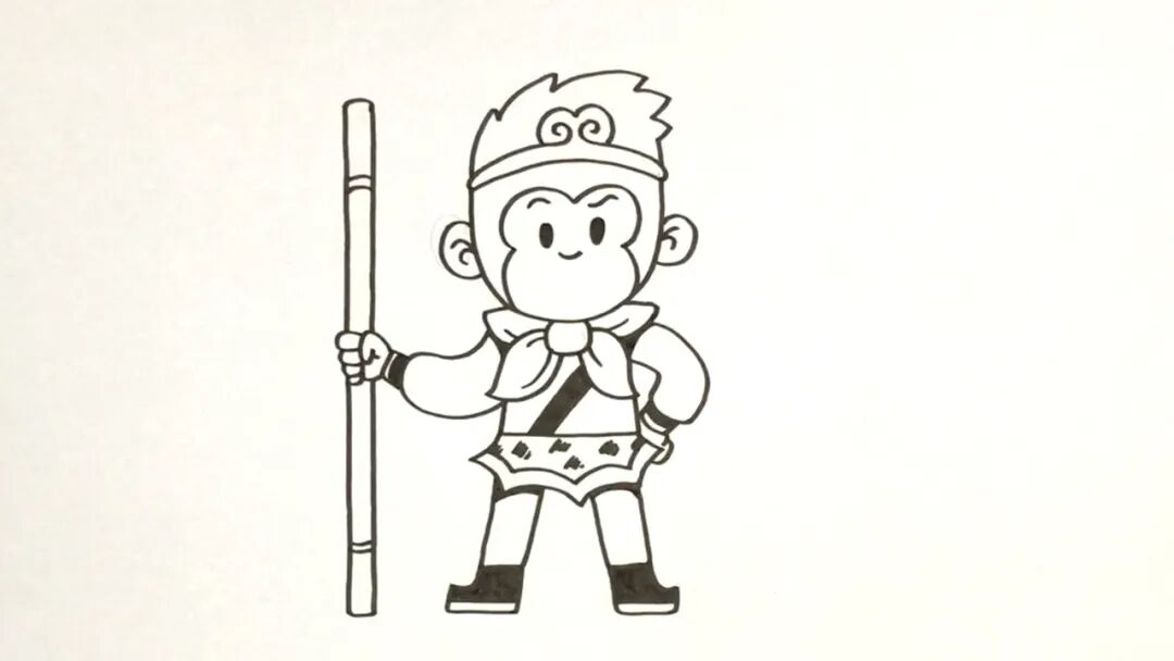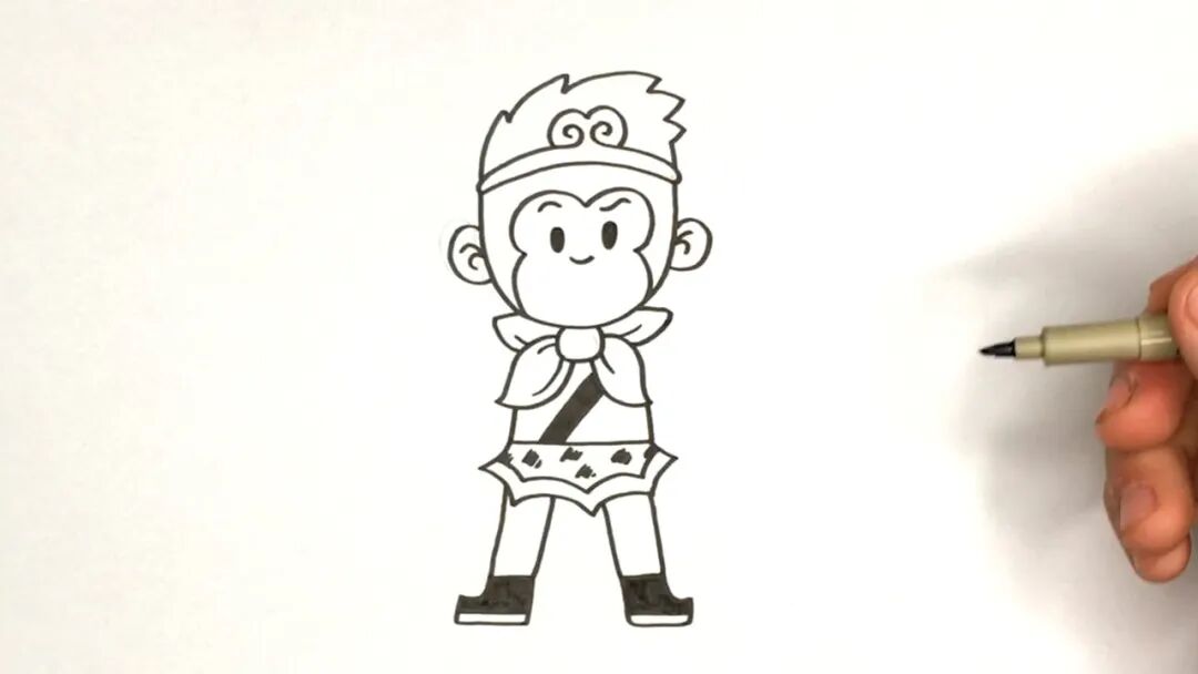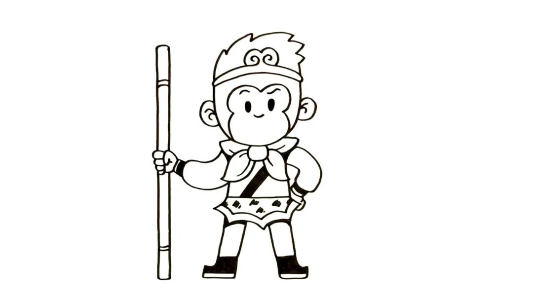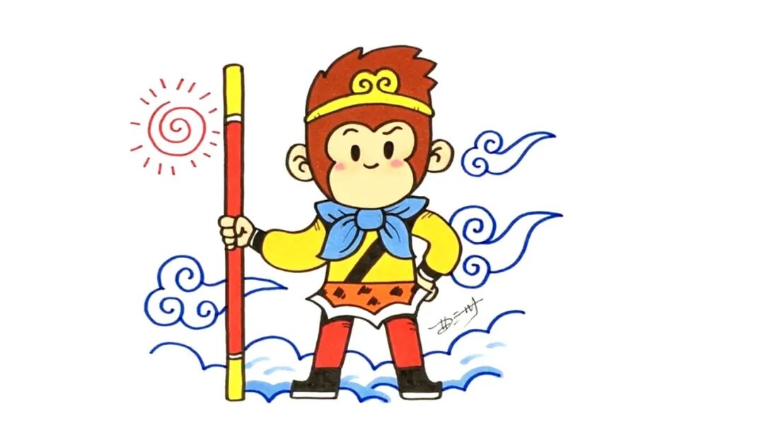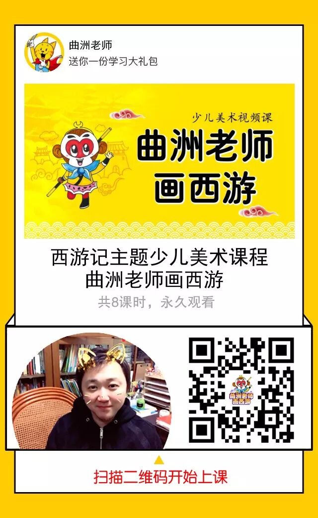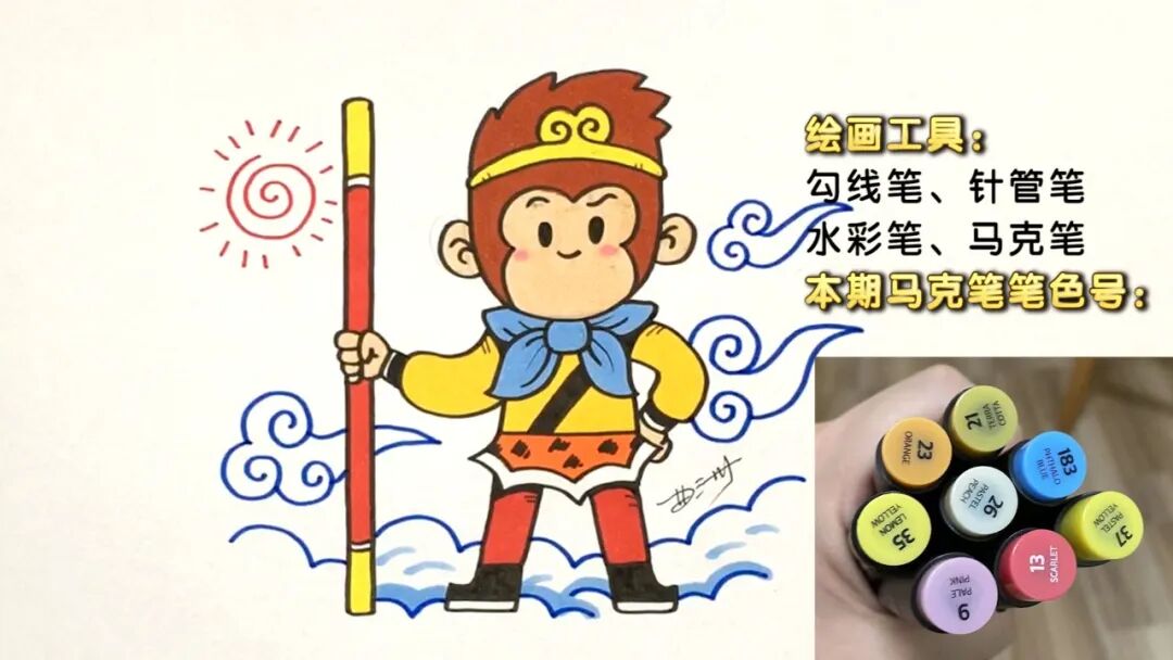 卡通人物孙悟空 超详尽教程 暑假到了 来跟曲洲老师一起 画出西游人物吧 今天要登场的是 视频未加速 欢迎大家跟我同步学习 绘画时间:20分钟 绘画对象:少儿、青少年 绘画工具:素描纸、针管笔、水彩笔、硬头马克笔 绘画顺序:铅笔打稿、勾线、上色 视频教程 儿童画绘画流程以及工具介绍 1.构图 构图为画面的创意阶段,可使用铅笔在素描纸 上绘制草图,铅笔可选用2B铅笔、自动铅笔 2.勾线 铅笔稿完成后,可使用针管笔、记号笔、 水彩笔勾线,勾线完成后擦除铅笔稿。 3.上色 主要上色工具有马克笔、水彩、水粉、油画棒、 彩铅等,要注意的是水彩笔不宜作为上色工具 图片教程 孙悟空简单画法 本款手抄报所使用的马克笔色号 线稿、灰线稿、大图 曲洲老师美术课 《曲洲老师画西游》 《曲洲老师画西游》 这套课程我筹备了8个多月 专为6-12岁的孩子们量身定制 报名方式:扫码付费报名