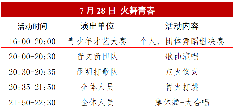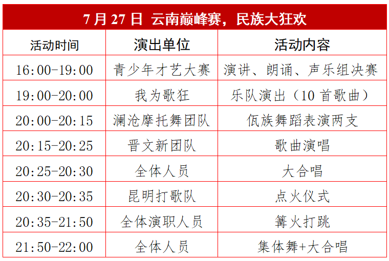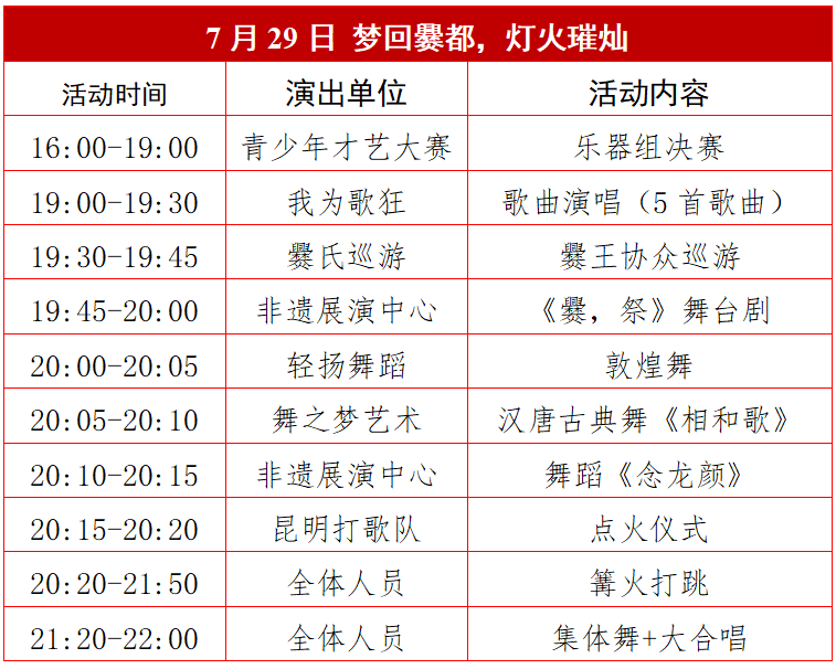 点击上方蓝字关注我们 7月27-29日火把节狂欢,滇中健康城携手晋文新、佤族摩托舞长老、昆明打歌队、我为歌狂乐队等为游客献上精彩演绎,云南巅峰赛,陆良打歌!??燃??燃??燃??狂热来袭! 活动时间:2024年7月6日起每周六晚7:00 活动地点:国家AAAA级景区—滇中健康城文化旅游景区 时间:7月27日、28日晚上8:00 地点:滇中健康城文化旅游景区南境广场大舞台 内容:现场互动、歌曲演唱、篝火打跳 时间:7月27日晚上7:00-10:00 地点:滇中健康城文化旅游景区南境广场 内容:佤族大长老陪你一起摩托摇、三跺脚 昆明打歌队,不会打歌学打歌,阿哥咋摆你咋摆 时间:7月27日、28日、29日 晚上7:00-10:00 地点:滇中健康城文化旅游景区南境广场 内容:打歌队巡游,现场打歌教学,昆明打歌队与您一起篝火狂欢。 时间:2024年7月27日晚上7:00-8:30 地点:滇中健康城文化旅游景区南境广场 内容:陆良本土最具实力代表乐队激情献唱,嗨翻火把节之夜。 时间:7月27日-29日上午8:30-12:00 下午2:00-7:00 地点:滇中健康城文化旅游景区南境广场 内容:1400多名来自全国各地的参赛者通过声乐、舞蹈、器乐、书法等精彩的表演展示青少年多样化的才艺,激发少年儿童爱家乡爱祖国的热情。 时间:7月27日-29日晚上8:00-10:00 地点:滇中健康城文化旅游景区南境广场 内容:万人篝火打跳 时间:2024年7月29日晚上7:00-8:00 地点:滇中健康城文化旅游景区南境广场 内容:演职人员身穿汉唐服装,重现千年前爨氏家族兴盛景象,通过活动爨王招婿、爨氏巡游古城、轻歌漫舞等表演,宣传弘扬爨文化。 时间:2024年7月29日晚上8:00-8:35 地点:滇中健康城文化旅游景区南境广场 内容:汉唐风韵,轻歌漫舞,梦回爨都,歌舞升平。 时间:7月27日-29日晚上9:50-10:00 地点:滇中健康城文化旅游景区南境广场 “沙绘世界·爨魅陆良”第二届沙画艺术节暨爨文化旅游节之“欢乐打歌·爨嗨陆良”系列活动于7月6日起每周六晚7:00,组合一支着装统一、风格不一的特色表演队,轮流至滇中健康城开展“特色活动+固定活动”的“打歌”表演,特色活动形式有民俗舞蹈、演唱、非遗表演等不同形式,固定活动为现场篝火“打跳”,每场活动持续2—3小时。 活动节目表↓ 2024年8月24日 乡镇专场 注:以上活动根据当天天气情况决定是否如期举行,所有活动最终解释权归滇中健康城所有。 自驾路线:点击下方地图或导航至“滇中健康城文化旅游景区”即可 来源:滇中健康城 长按二维关注我们 ? ? ? 陆良人都在看![]()