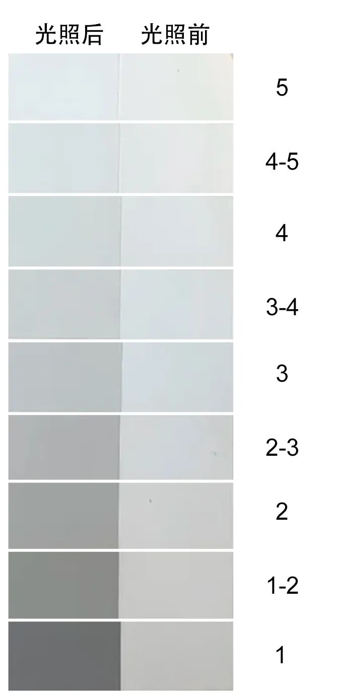 检测耐光性的灰度色卡:使用灰度相机拍摄皮革光照后与光照前的照片对比其颜色变化,颜色不变耐光性为5,颜色改变严重为1