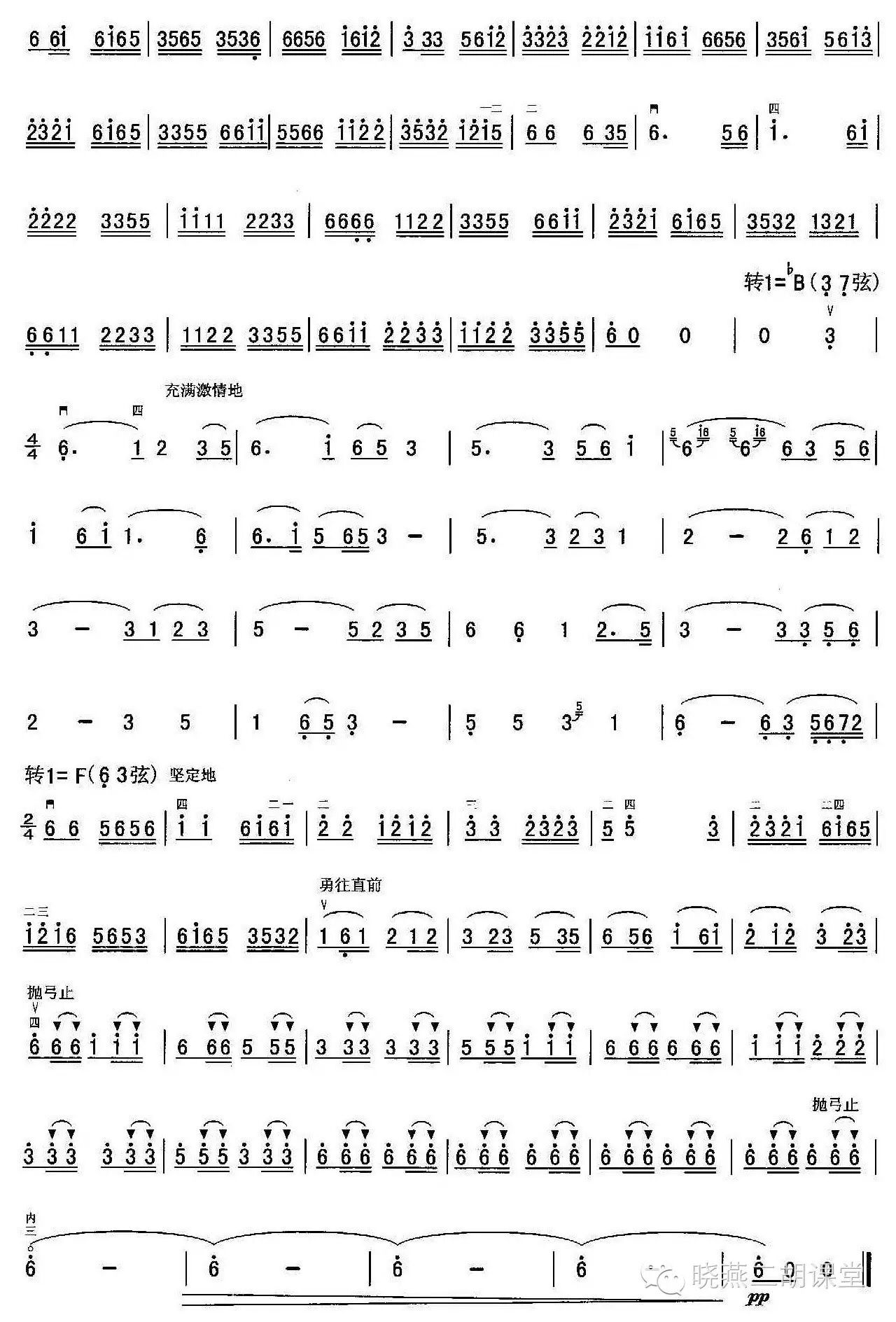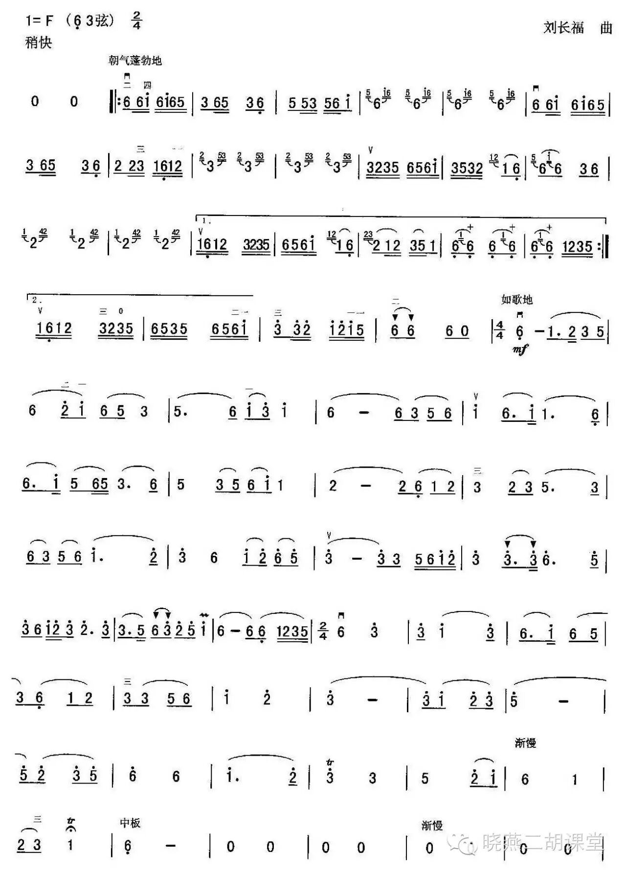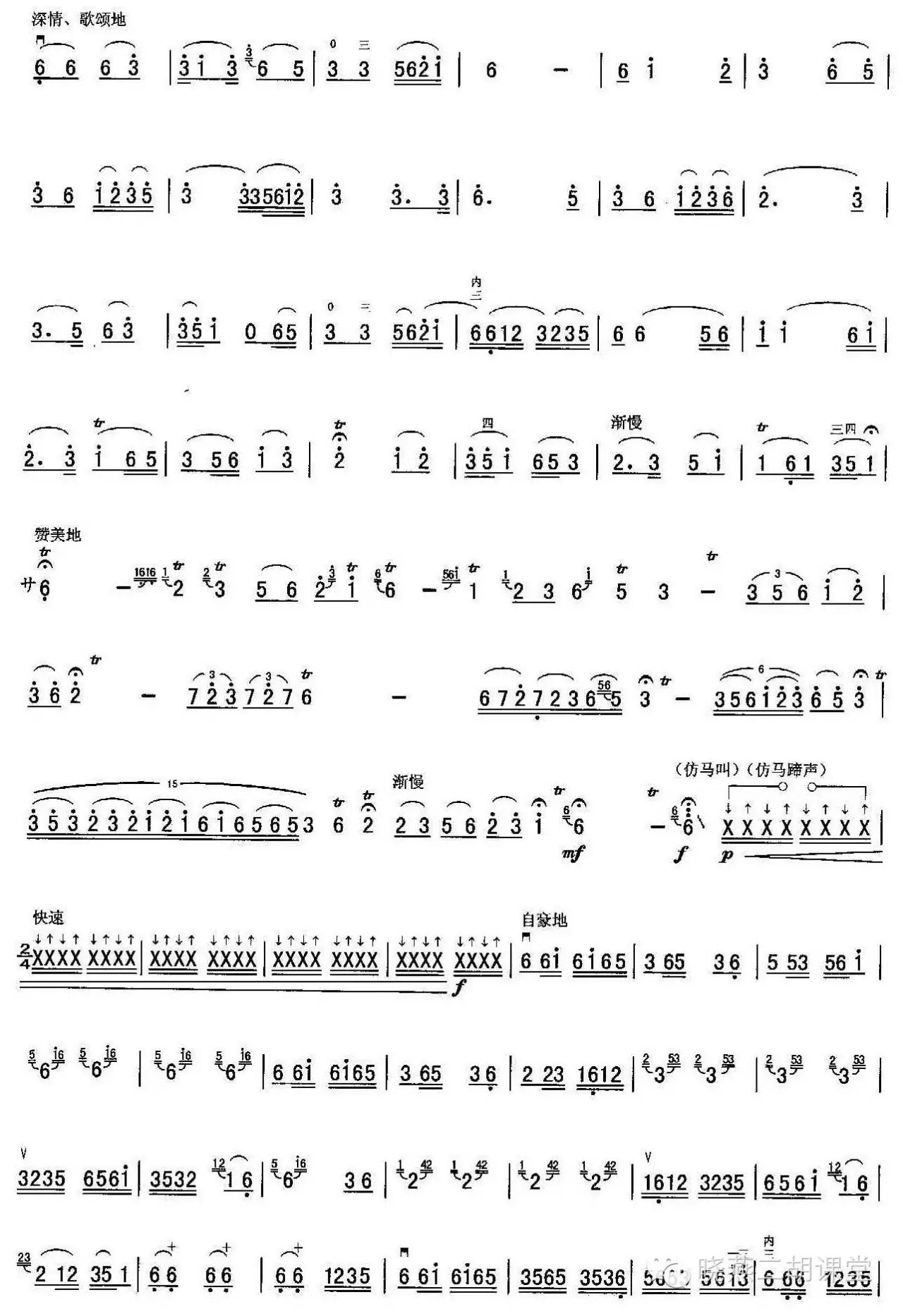 第二段:慢板。草原上一片安宁与祥和,天高云淡,碧草如茵,小河淌水,牛羊成群,苍茫的大草原无限广阔与壮美,年轻的草原歌手引吭高歌,唱起了悠扬的牧歌。接下来的华彩乐段,二胡模仿马头琴的技法,将蒙古长调音乐起伏迂回的旋律、连绵不断的颤音演绎得惟妙惟肖、淋漓尽致。然后,二胡模仿骏马的嘶鸣声,将音乐引入再现部。