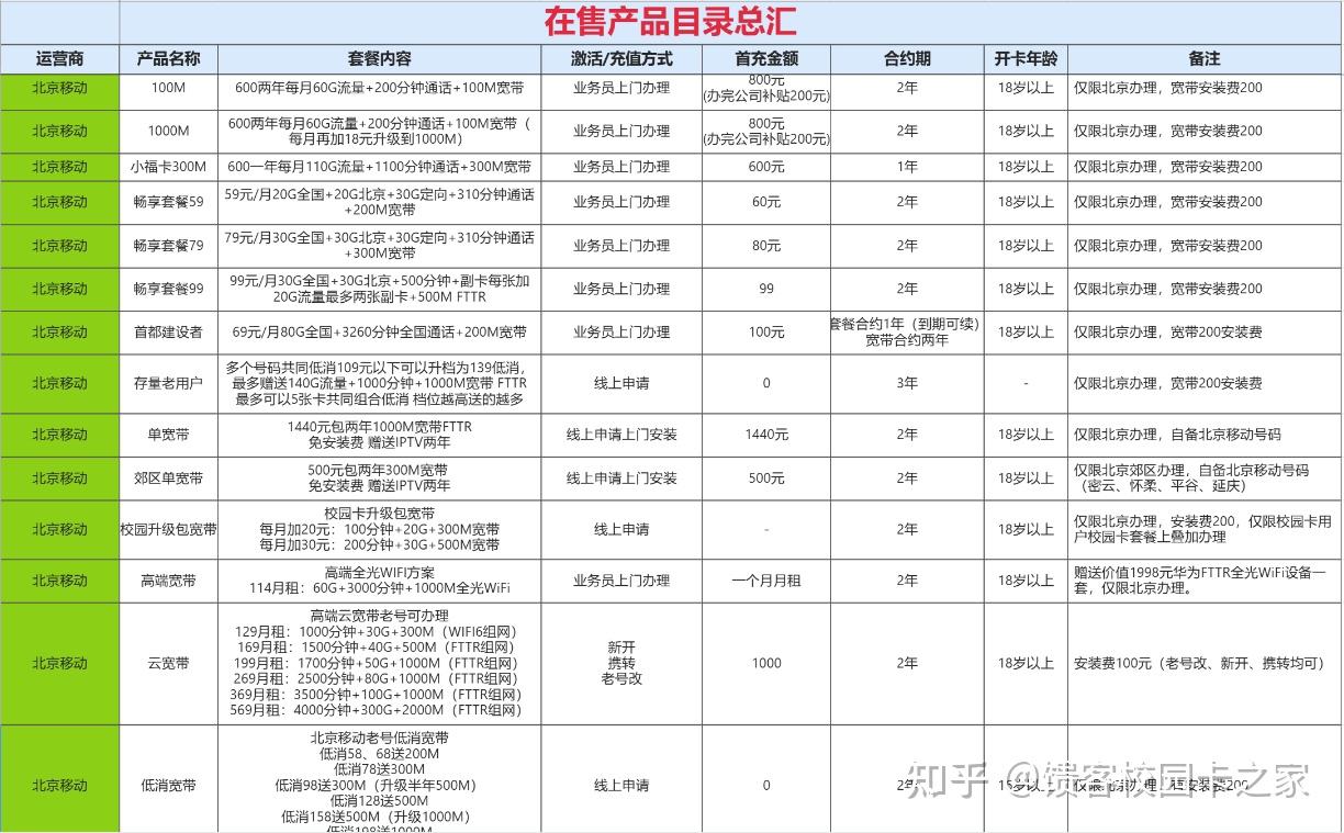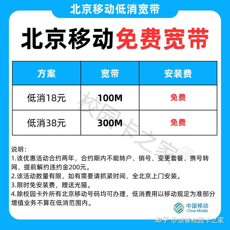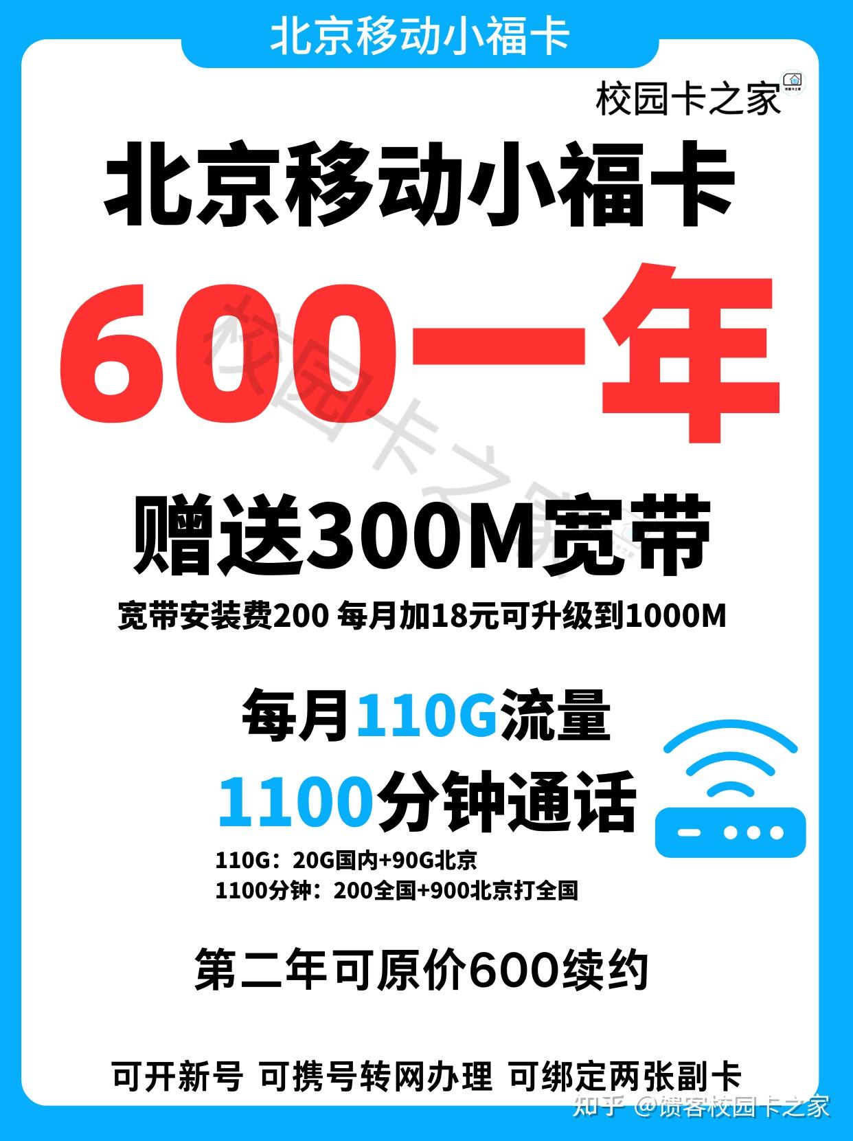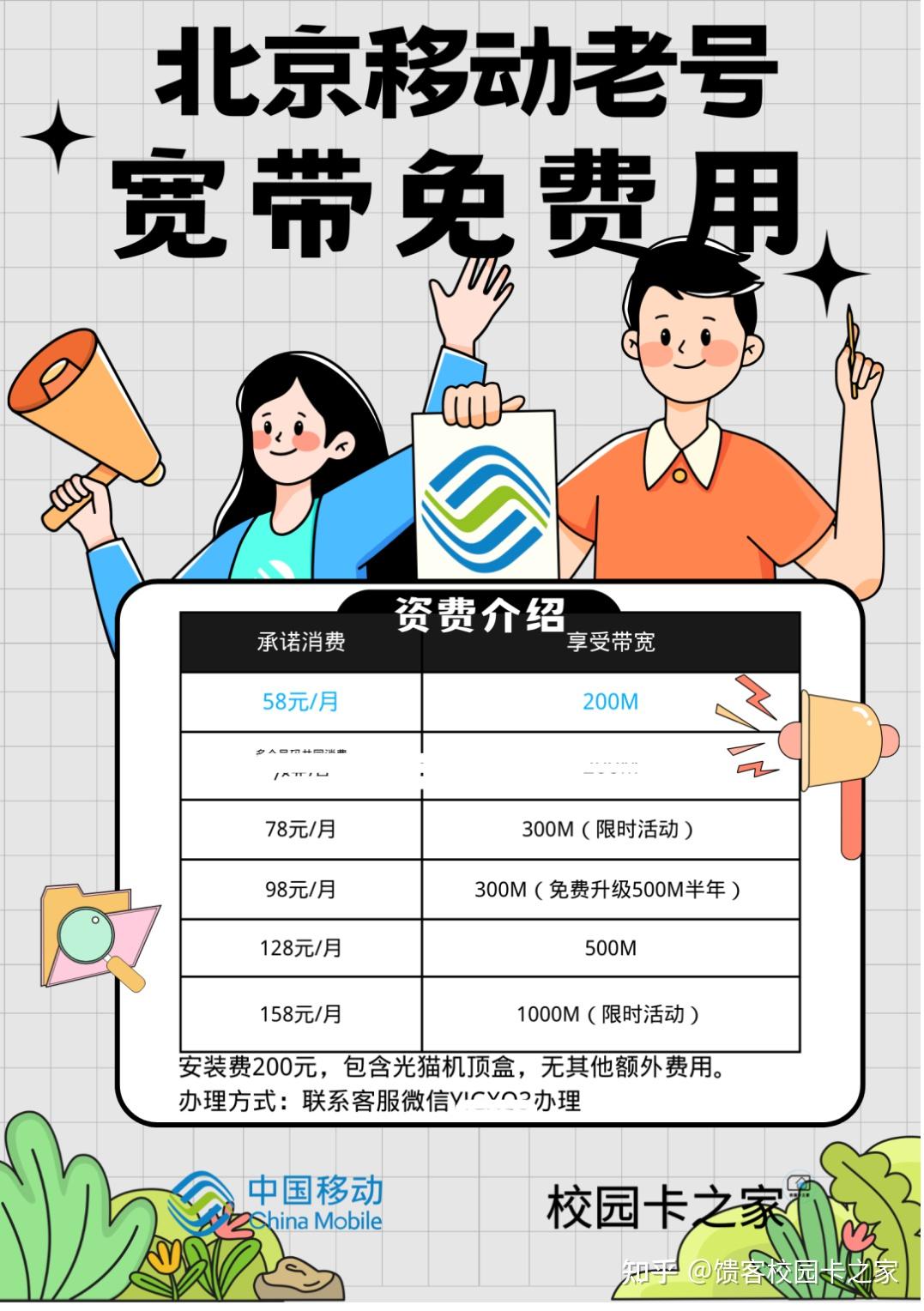 北京移动宽带优惠活动汇总 一图汇总目前能办的优惠活动 图片如果看不清可以单独联系我们客服进行咨询。 千兆FTTR宽带价格终于打下来了!!直接免安装费送FTTR送IPTV 这个活动对于北京移动老用户来说非常合适,直接在老号上面办理,不用改动套餐内容,不影响原来的套餐使用,只要两年内保证不注销不转网就行,套餐可以随便改,也就是只绑定号码绑定套餐,跟套餐没有任何关联。 这个业务全北京可以办理,只需要提供一个北京移动手机号和安装地址给我们客服就行,剩下的就等安装师傅们上门去安装。装好以后将费用支付给安装师傅就行了。 此外:密云、怀柔、延庆、平谷 四个郊区还有300M的老号宽带可以办理,仅需500包两年。其他区无法办理。 办理方式:联系校园卡之家客服下单 北京移动校园卡大家应该很熟悉,基本每年暑假都会和大家见面,我这目前的套餐和大家暑假办理的没啥区别,唯一区别就是现在通过我们渠道办理可以赠送一条100M家庭宽带。前段时间只能携号转网办理,现在政策更新可以直接开新号也可以携号转网,全北京上门办理,目前不限制年龄。 原价800两年,公司限时补贴价600包2年(装好后联系本渠道客服申请200元补贴),月均25元,每月60G流量+200分钟通话+10条短信赠送100M宽带。宽带可以升级到1000M每月加18元就行,还额外送10G流量。 费用详情:600包含了套餐内的流量通话短信以及100M宽带的两年使用费,宽带只需支付200元安装费,赠送光猫。 合约介绍:800包2年套餐合约2年(补贴后600两年),宽带合约两年。不能提前注销或者改别的套餐,宽带提前解约违约金200元。 办理方式:携号转网办理请联系校园卡之家客服下单 如需开新号直接线上申请选择800两年,收到卡后联系校园卡之家客服线上报装宽带并申请补贴,下单后第一时间联系我们客服报备。 没赶上大福卡的小伙伴一定不要错过这个小福卡,原价948一年目前公司补贴价600一年,并且第二年可以续约。 110G流量:20G全国流量+90G北京流量 1100分钟:200分钟全国通话+900分钟北京打全国 宽带安装费200元,每月可以加18元升级到1000M 套餐亮点:流量多、通话多、送宽带、送副卡(开新号作为副卡可免费1年)、第二年可续约、可开新号可携号转网办理。 北京老号低消58可以赠送200M,每个月加个18元的提速包可以升级到1000M,第一年每个月还赠送10G流量。 此活动免费办理,安装费200元需要自己承担,没有其他收费。 2.北京移动老用户参加过特殊优惠的可能无法享受此活动。 3.北京移动老号月消费58元以上即可享受200M宽带。 4.月消费不满58元,按58元收取。 5.享受宽带优惠后原套餐不变,满足低消即可。 6.此优惠活动合约期2年,宽带合约期2年,提前解约需支付违约金200元。 7.安装费200元为移动统一收取,包含千兆光猫。 8.宽带安装完毕后,如需办理提速包请联系本店客服办理升级1000M。 很多小伙伴问不想换号怎么办优惠宽带,其实有两个方案: 第一可以考虑低消赠送宽带 第二是可以考虑上面介绍的1056两年的单宽带。 低消58元这个活动也没有什么限制,只要你北京移动号码每月消费58元就行了,如果你的套餐是58元左右的话套餐内容还不错的话那办这个很合适。如果你的套餐没什么内容,或者价格比较贵,那么不用考虑这个了,建议办迎春卡更合适,具体你们自己判断一下。 北京移动真的杀疯了,低消18送宽带都弄出来了,就问还有谁!!!重点是还免安装费!!啥也不说了,家里有用北京移动号码的抓紧时间冲吧!!机会不等人哦! 校园卡包年套餐以及已经绑定了移动宽带的号码无法参加此活动,可以先解除已经绑定的宽带,然后再来办理。 添加校园卡之家客服下单,然后安排安装师傅上门安装。(备注:低消宽带) 北京移动畅享套餐最多可绑定两张副卡 这个套餐目前办理的比较多,性价比还是很高,毕竟这个赠送200M宽带家用就非常合适了,同时还有通话和流量能满足日常使用,其实家里和上班的地方有宽带以后,手机流量根本就用不了多少,反正我每个月的流量都是用不完,每个月采用了10G左右。 用过北京联通宽带的小伙伴肯定都清楚北京联通宽带的价格了,营业厅或者官网最便宜的就是300M的宽带,每月115元,再往上就是166、199之类的价格了,而且有些渠道还是需要预存才能享受到115这个折扣价格。 一直有小伙伴让我把联通宽带价格打下来,这个实话实说确实有难度,争取过很多次都没有效果,今天终于给大家搞来了一款200M的优惠活动,喜欢联通宽带的一定别错过!! 这款套餐的介绍比较简单,重点就是200M宽带,同时赠送一张手机卡每月15G流量+400分钟通话,安装费100元一次性预存828元一年的费用即可。然后是限时限量的活动,有需要的小伙伴就抓紧时间,我们全北京可以上门办理,非常方便。 除此之外,联通FTTR和移动FTTR活动也是目前办理的比较多的,价格贵一点但是可以享受到更高端的宽带使用体验。 办理方式:联系校园卡之家客服预约即可 北京移动全家享5折优惠最多可绑定两张副卡 全家享套餐在移动官网或者打客服电话可以查到,我们只是加了个折扣,可以放心办理。 之前由于渠道方缘故,这个五折活动要收取一定的手续费,这次给把携号转网办理的手续费给免了,实打实的5折优惠,大家把有需要的可以联系校园卡之家客服下单,备注(全家享5折) 携号转网办理的用户,免手续费,全北京地区业务员上门办理。 这个套餐哪哪都好,流