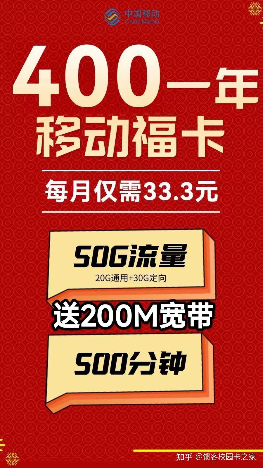 套餐名称 福卡400一年 套餐内容 200M宽带20G通用流量+30G定向流量1500分钟通话 套餐资费 400包一年优惠期一年,一年后看到时候的政策也可以改别的套餐或者注销 安装费用 宽带安装费200元(移动统一收费)无其他收费项目 办理方式 填写登记表,附近业务员上门办理号卡然后安装宽带 关于移机 宽带可以办理移机,中途搬家可以联系移动客服办理移机
