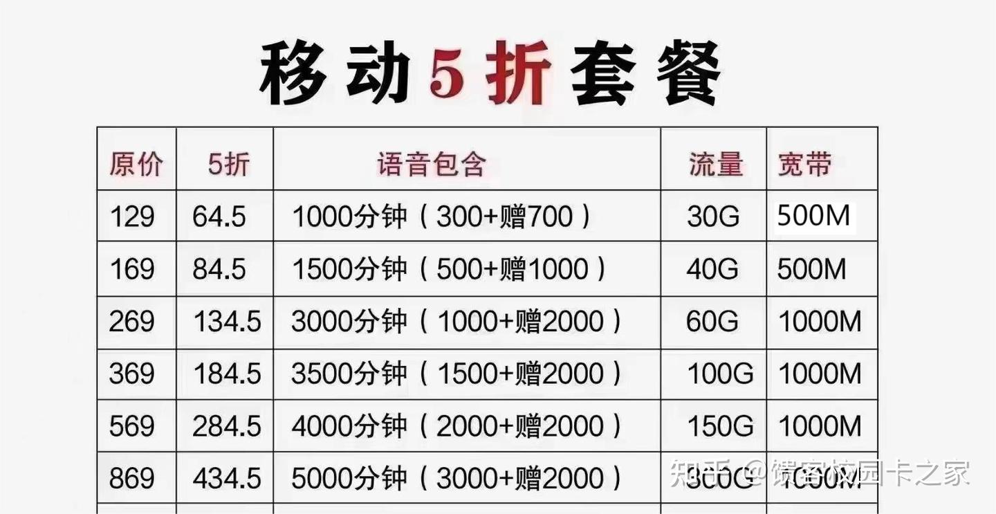 套餐名称 移动全家享5折优惠 套餐内容 有好几个档位,这里就介绍两个:原价99,折后50/月,20G流量+1000分钟通话+300M宽带原价129,折后65/月,30G流量+1500分钟通话+500M宽带折扣优惠期两年 套餐外 5元/G+0.15元/分钟 宽带安装费用 宽带安装费200元(移动统一收费) 办理方式 可开新号,可携号转网办理。填写登记表,附近业务员上门办理号卡然后安排安装师傅上门安装宽带 移机 宽带可以办理移机,请打客服电话办理