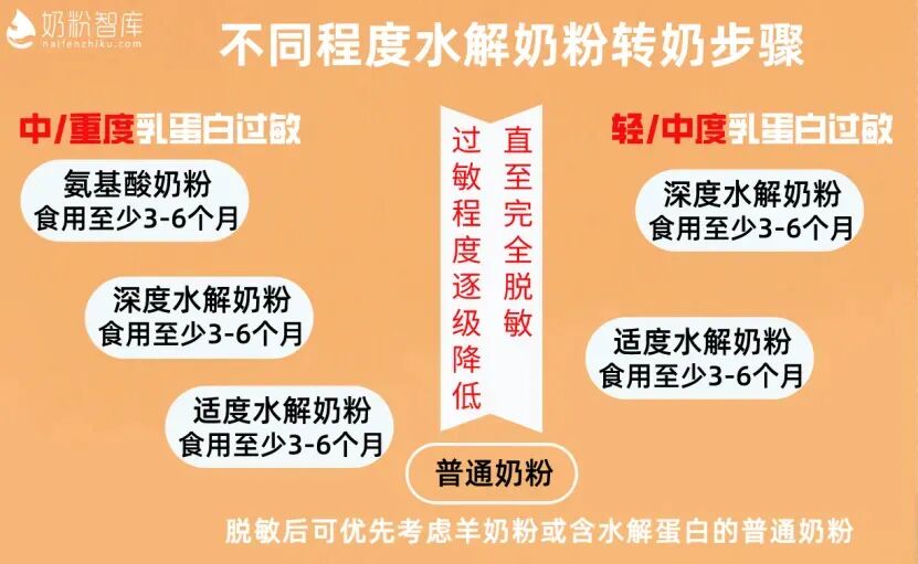 正确解答:每种程度的水解奶粉至少要喝3-6月进行观察和巩固。确认宝宝过敏程度降低后,才能转回低等级的水解奶粉。最后,在宝宝完全脱敏后,再转到普通奶粉。这个过程要做好逐级转奶。误区五、选择添加适度水解蛋白的普通婴配粉来应对过敏?目前市面上有许多普通婴配粉添加了适度水解蛋白等有助于宝宝更好消化吸收的营养物质。看到“水解”二字,一些家长误以为添加了适度水解蛋白的普通奶粉也能帮助宝宝抵御过敏。正确解答:添加了适度水解蛋白的普通婴配粉仍然含有大量完整的牛奶蛋白,不适合已经确定对牛奶蛋白过敏的宝宝。对于过敏体质或已经确诊过敏的宝宝,应食用相应的乳蛋白水解特殊医学用途配方食品。总之,以上案例反映出,大家对过敏宝宝的喂养还存在许多疑惑,可能对日常护理也不太了解。接下来,我们将详细讲解如何正确护理过敏宝宝。在此之前,我们先来了解一下过敏宝宝的喂养原则。