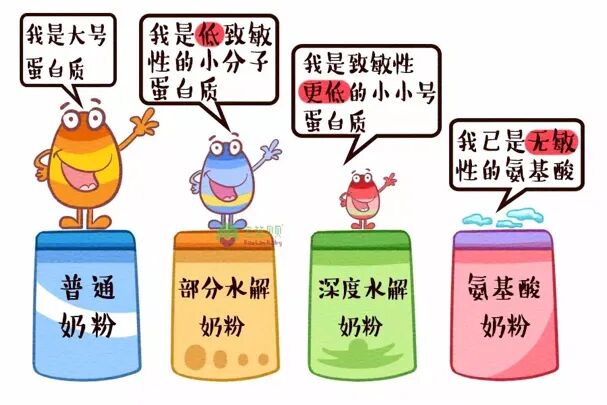 水解奶粉,也被称为低敏奶粉,水解奶粉通过特殊技术,将牛奶中大分子整蛋白水解成了中短肽的小分子蛋白,从而降低了牛奶蛋白的致敏性。根据水解程度的不同,水解蛋白配方奶粉可以分为部分水解配方奶粉(pHF)、深度水解配方奶粉(eHF)和氨基酸配方奶粉(AAF)三种,水解程度依次从低到高。 水解奶粉