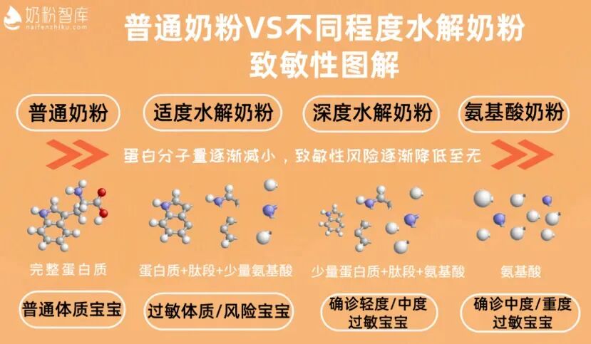 三种水解奶粉,它们的主要区别就是蛋白质的水解程度不同,相应的,也就适用不同过敏程度的宝宝吃。 现在我们就来一一说明下。适度水解奶粉,作为水解程度最低的一种,与普通奶粉最为接近。从其配料表中,我们可以看出,它仅将乳清蛋白部分处理成水解乳清蛋白,其他成分与普通奶粉相差无几。正因如此,其营养价值也与普通奶粉相差无几。有些人可能会认为,水解奶粉的营养价值会低于普通奶粉,但实际上,这种水解蛋白能更好地被消化吸收,更适合肠道功能较弱的小婴儿。有研究证明,适度水解的配方粉能有效降低宝宝过敏的可能。因此,我建议在宝宝出生前4个月,由于种种原因无法母乳喂养的宝宝,可以选择适度水解奶粉作为首选。这不仅是因为适度水解奶粉能有效预防过敏,而且即使宝宝喝普通奶粉不过敏,也可以选择适度水解奶粉,以预防过敏的发生。尤其是对于家族有过敏史或者消化能力较差的宝宝,选择适度水解奶粉更有帮助。对于已经发生对奶粉过敏,但程度较轻的宝宝,更需要吃适度水解奶粉来缓解症状。然而,在宝宝6个月以后,如果一切正常,就没有必要长期吃适度水解奶粉了。深度水解奶粉,正如其名,是一种将蛋白质进行深度水解的奶粉,其水解程度比适度水解奶粉更高,主要用于确诊牛奶蛋白过敏的宝宝。在医学上,它被归类为特殊奶粉。深度水解奶粉的味道不如普通奶粉和适度水解奶粉,但是相比氨基酸奶粉,它的味道要好一些。价格上,深度水解奶粉比适度水解奶粉贵,但比氨基酸奶粉便宜。如果宝宝确定对牛奶过敏,即使喝了适度水解奶粉还是过敏,那么就需要选择深度水解奶粉了。那么,长期喝深度水解奶粉,会不会导致营养不足呢?深度水解奶粉与适度水解奶粉的区别除了乳清蛋白是深度水解的之外,还有碳水化合物来源大多用的是麦芽糊精,低乳糖或者无乳糖。这是因为一般需要喝深度水解奶粉的宝宝,也可能同时有乳糖不耐受,所以才会这样设计。但是相比乳糖,麦芽糊精的营养价值确实会低一些。由于深度水解奶是将乳糖换成了麦芽糊精或者葡萄糖,所以其营养确实会不如普通奶粉。尽管如此,总体来看,营养差别不会太大,能够满足宝宝生长发育的需求。毕竟,如果宝宝真的对牛奶过敏需要吃深度水解奶粉,也不能因为它营养不如普通奶粉好而不吃,两害相权只能取其轻。氨基酸奶粉是用于重度奶粉过敏的宝宝。如果宝宝吃深度水解奶粉依然过敏,那就只能选择氨基酸奶粉,因为氨基酸是蛋白质的最小分子形态,不需要经过消化,直接被吸收。对于重度奶粉过敏的宝宝,需要从氨基酸奶粉开始喝,再喝深度水解奶粉,再从适度水解奶粉过渡到普通奶粉,一步步来。氨基酸奶粉的味道是最差的,基本上都是无乳糖配方,用麦芽糊精或者葡萄糖替代了乳糖。其营养肯定无法完全跟正常奶粉相比,但如果是过敏需要吃,那就没办法,总比不吃强。这些特殊奶粉是在特殊情况下无奈的选择,当宝宝需要吃的时候,父母也不必犹豫和纠结,毕竟过敏很严重,只有吃这些特殊奶粉才可以避免过敏。在宝宝的健康面前,其他的都是次要的。
