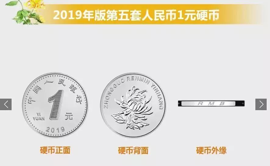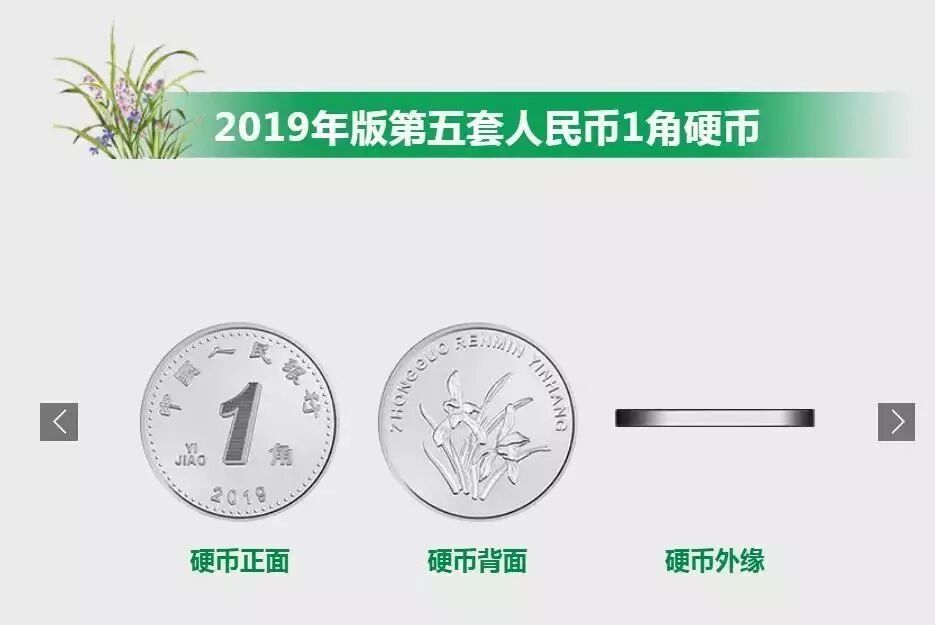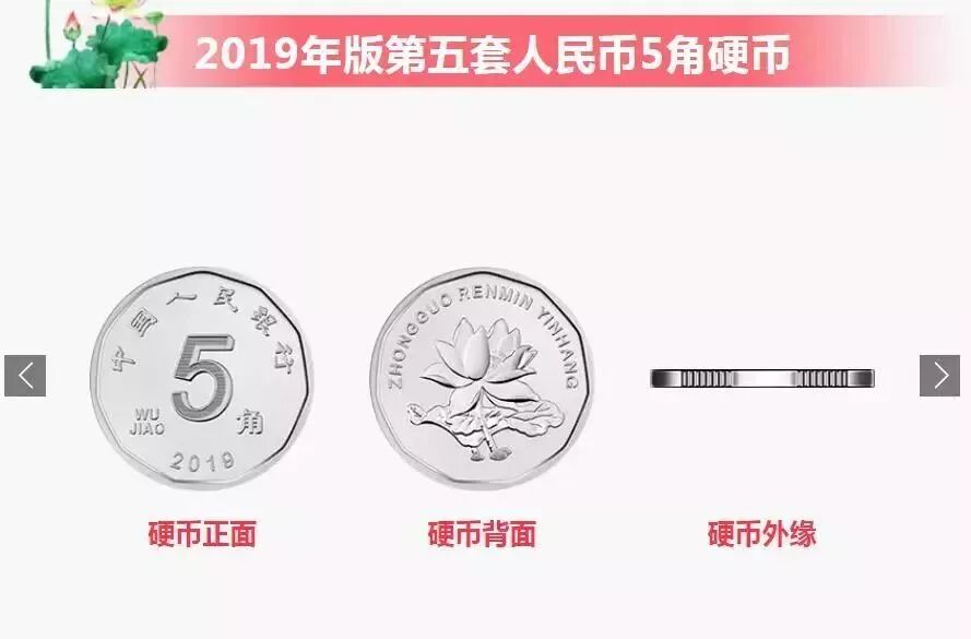与1999年版第五套人民币1元、5角硬币和2005年版第五套人民币1角硬币相比,2019年版第五套人民币1元、5角、1角硬币调整了正面面额数字的造型,背面花卉图案适当收缩。