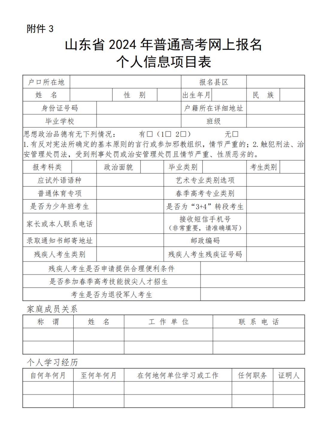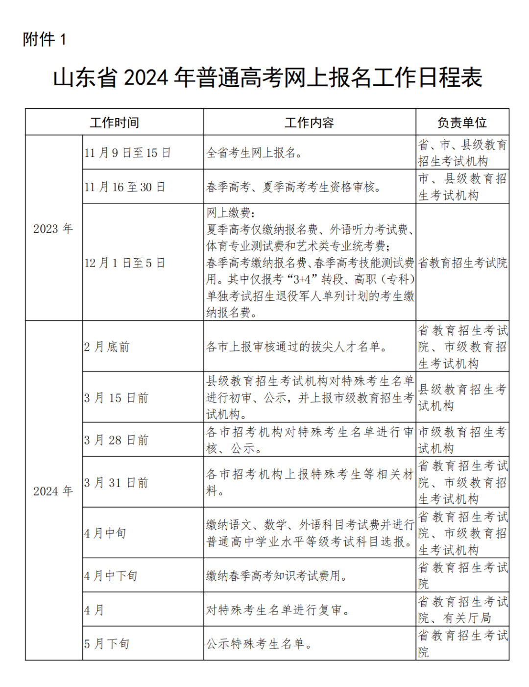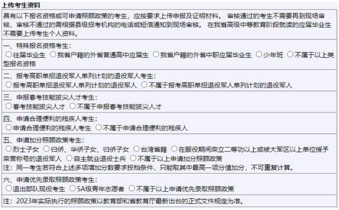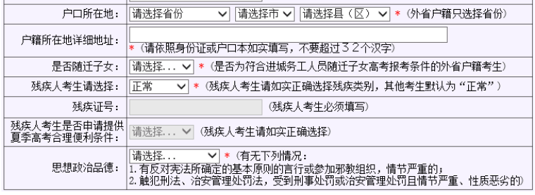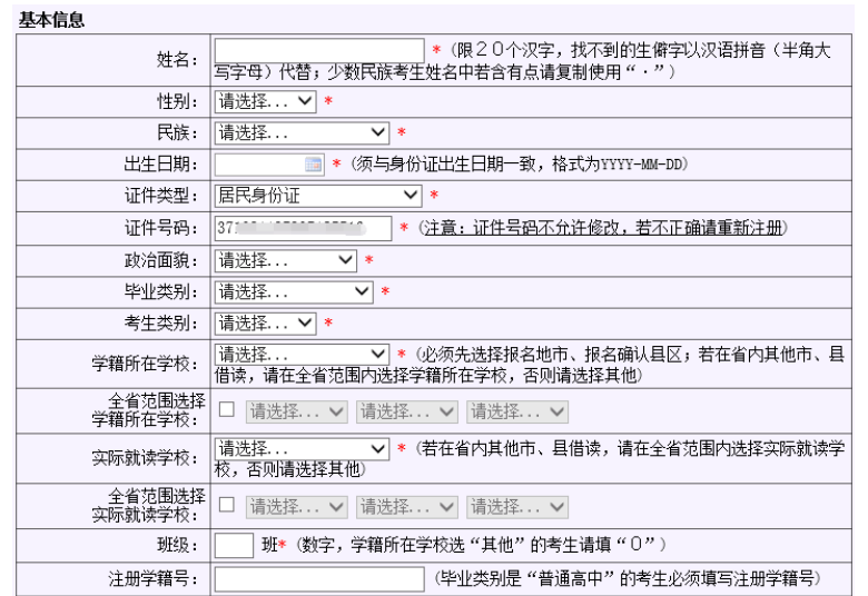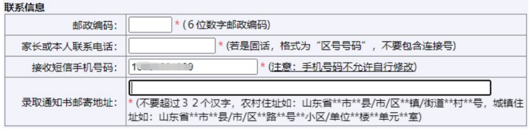 2024年山东高考报名通知详细时间安排已经公布!11月9日开始报名! 报名时间:2023年11月9日至15日 资格审核时间:2023年11月16日至30日 网上缴费时间:2023年12月1日至5日 *具体时间安排见下图 为使考生进一步了解夏季高考报名有关政策,今天对报名个人信息项目表进行解读! 报名区县 高考报名考场安排会根据报名区县来进行区分,报名区县在哪就需要去哪高考 其中: 应届生:户籍地和学籍地可2选1 非应届生(包括复读生和社会考生):只能选择户籍地 户籍在山东,学籍在外省的:不论应届还是往届,均只能选户籍地 非山东户籍,但山东学籍的:不管应届还是往届,均只能选学籍地 小录提醒 走读、部分公安类院校、面向农村和原贫困地区招生专项计划等招生类型对生源地均有严格要求,考生须在生源地报名才能享受相关招生政策。 网上填报信息 性别:男、女 民族:汉族、回族等民族 政治面貌:中共党员、中共预备党员、共青团员、民革会员、民盟盟员、民建会员、民进会员、农工党党员、致公党党员、九三学社社员、台盟盟员、无党派民主人士、群众 毕业类别:高中、中师、中专、职高、技校、高职(专科)、本科(含)以上学历、高中毕业同等学力、其他。(高中毕业同等学力,需要参加过合格考才能开具同等学力证明) 考生类别:根据户籍选择农村和城市,区分农村应届、农村往届、城市应届、城市往届 毕业学校:毕业学校是根据报名区县的选择来筛选的。 如果要选择其他地市区县的学校,请点击下方的全省范围选择毕业学校 班级:填写毕业学校的班级,其他可选0 户口所在地详细地址:按照户口本或者身份证的如实填写即可。如果是外省户籍只选择省份即可 是否随迁子女:是、否 残疾人考生:视力、听力、言语、肢体、智力、精神残疾,多重残疾和其他残疾 思想政治品德:无下列违法情况、有第1条情况、有第2条情况、1、2条都有 是否退役军人考生:是、否 小录提醒 1.户口本和身份证地址不一样的,如果没有进行户籍迁移,仍以户口本上面的地址为准。 高考报名个人简历2.【随迁子女(或外来务工子女)】指的非山东省户籍的考生,跟随非山东省户籍的父母来山东生活学习,具有山东省高级中等教育学校学籍,在山东有3年完整学习经历,并合格毕业或结业。 如果考生户籍在山东的A市,随父母在山东的B市生活学习,则不算随迁子女(或外来务工子女)。 简单来说父母户口、考生户口均在省外,考生在山东省有完整学籍选“是”;父母户口均在省内选“否”。 春季高考 请注意,春季高考应届生须为中等职业教育应届毕业生。 春季高考类别:现代农艺、烹饪、畜牧养殖、建筑、机械制造、设备维修、机电技术、自动控制、电气技术、电子技术、化工与环境、服装、车辆维修、运输、数字媒体、网络技术、软件与应用技术、医学技术、药学、护理、财税、市场营销、电子商务、国际商务、物流管理、酒店管理、旅游管理、公共服务与管理、学前教育、艺术设计。共计30类 如果符合技能拔尖人才的,应该选申报 选择夏季高考 报考科类:普通类、艺术类、体育类 应试外语语种:英语、俄语、日语、德语、法语、西班牙语 艺术专业类别选项:美术与设计类、书法类、音乐类、舞蹈类、播音主持类、表(导)演类、戏曲类 音乐专业声乐技能:美声、民族、流行(通俗)、其他。 音乐专业器乐技能:键盘(钢琴、手风琴、双排键、其他)、民族乐器(古筝、扬琴、排箫、二胡、唢呐、三弦、竹笛、板胡、管子、笙、京胡、箜篌、琵琶、古琴、中阮、柳琴、大阮、民族打击乐、其他)、西洋乐器[萨克斯、长笛、小提琴、大提琴、单簧管、双簧管、长号、竖琴、中音号、次中音号、电贝司、电吉他、吉他、圆号、大号、小号、低音提琴、中提琴、大管(巴松)、西洋打击乐、其他]。 艺术体育类报名系统有变化新增加了舞蹈类舞种方向、表(导)演类方向以及是否守门员的选项。 舞蹈类舞种方向:中国舞、芭蕾舞、国际国标舞、现代舞、流行舞 表(导)演类方向:戏剧影视表演、戏剧影视导演、兼报戏剧影视表演和导演、服装表演 普通体育专项:200米、400米、800米、1500米、女100米栏、男110米栏、跳高、跳远、三级跳远、铅球、标枪、铁饼、篮球、排球、足球、乒乓球、武术、体操 是否守门员:如果选择足球,需要选择是否为守门员 是否少年班考生:是、否 联系信息 请注意,此处邮政编码请填写录取通知书邮寄的邮政编码 家长或本人联系电话:请填写注册系统之外的手机号 接受短信手机号码:此处系统根据注册手机号自动填充 录取通知书邮寄地址:不需要跟身份证,户口本地址相同。填写实际地址即可! 家庭成员 非必填项! 根据实际情况填写,如果无工作可选择务农、待业等 个人简历 个人简历:时间为入学年的9月1日~毕业年的6月1或者30日。单位写高中,职务填写学生、班长均可。证明人写校长或者班主任 应届生:初中学校+高中学校 复读生:高中学校+复读学校(在家自学的写居家自学即可)(证明人父母姓名) 社会考生:初中学校+工作经历 上传考生资料 具有以下报名资格或可申请照顾政策的考生,应按要求上传申报及证明材料; 审核通过的考生不需要再到现场审核,审核不通过的需要根据县级招考机构的电话或短信到现场审核。 在我省高级中等教育阶段就读的应届毕业生不需要上传个人
