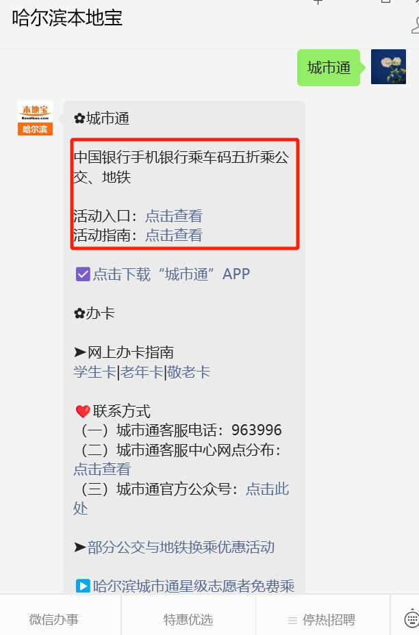 公交地铁5折乘车优惠哦点击公众号菜单栏或聊天对话框回复关键词:【?不是留言区】