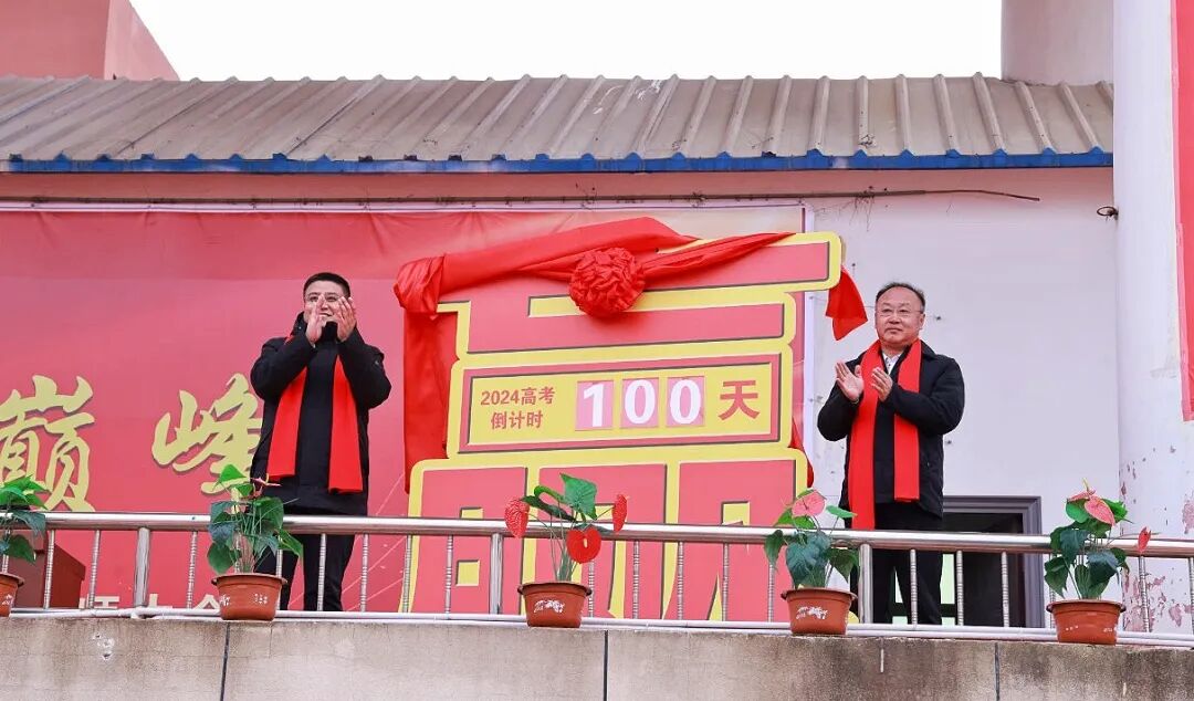 在激昂的旋律下,张冠群和梁忠林共同为高考100天倒计时揭牌。