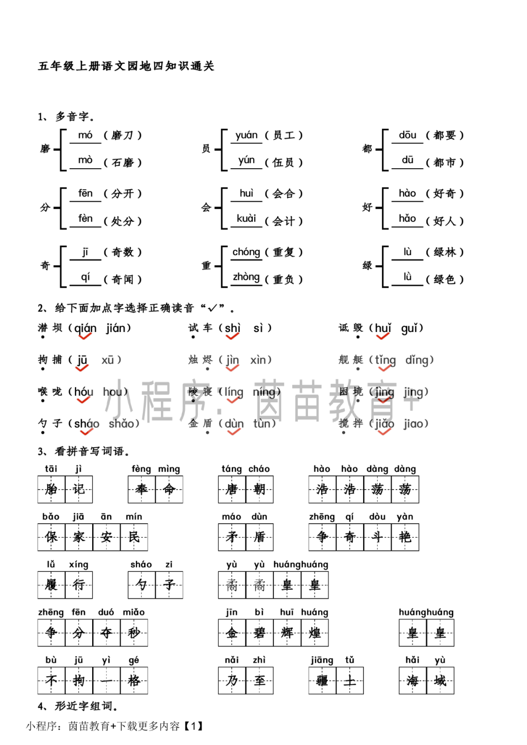 五年级上册多音字
