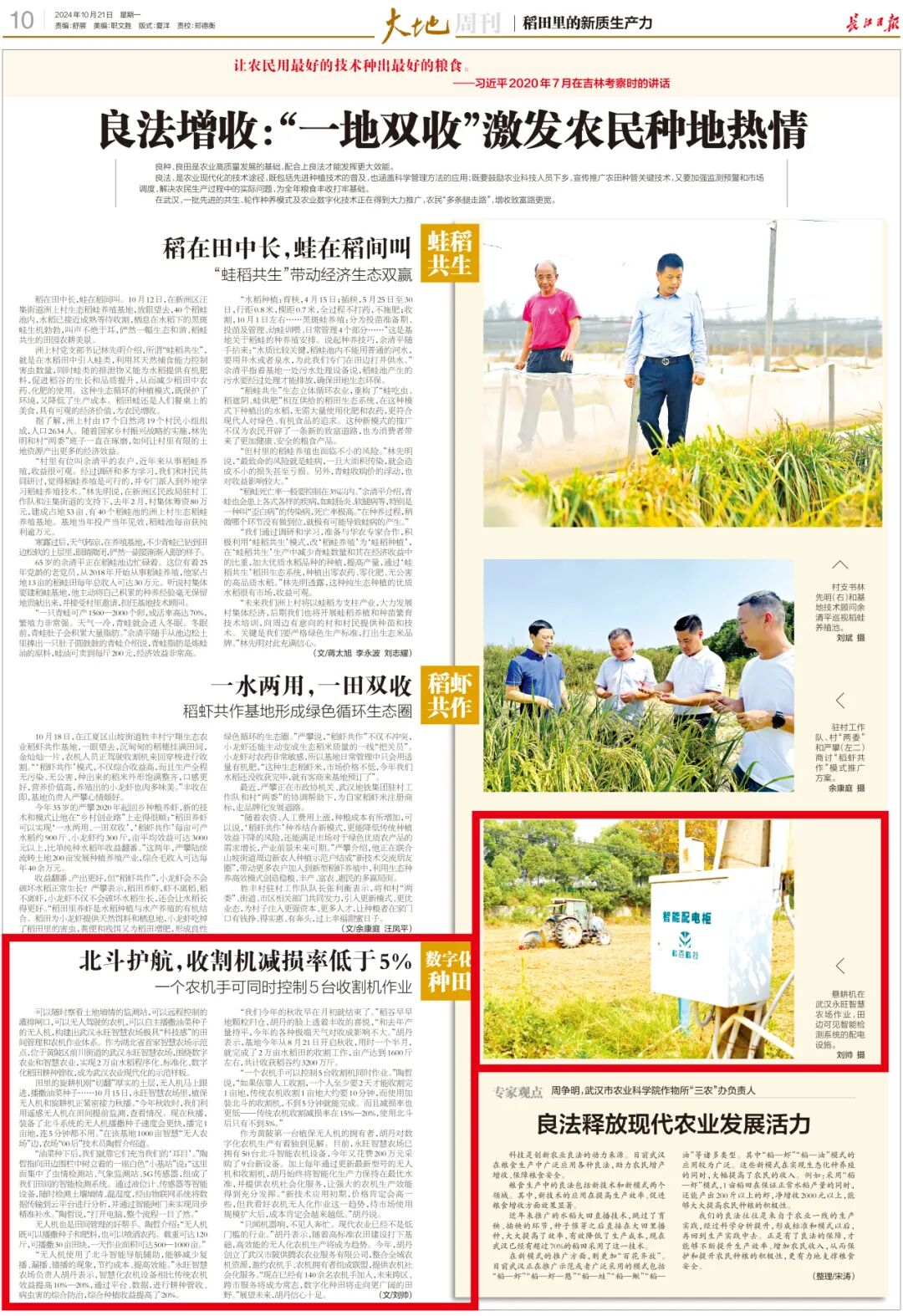 可以随时察看土地墒情的监测站,可以远程控制的灌排闸口,可以无人驾驶的农机,可以自主播撒油菜种子的无人机,构建出武汉永旺智慧农场极具“科技感”的田间管理和农机作业体系。作为湖北省首家智慧农场示范点,位于黄陂区前川街道的武汉永旺智慧农场,围绕数字农业和智慧农业,实现2万亩水稻程序化、标准化、数字化稻田耕种管收,成为武汉农业现代化的示范样板。 武汉永旺智慧农场里打造了1000亩“无人农场”。刘帅 摄 田里的旋耕机刚“切翻”厚实的土层,无人机马上跟进,播撒油菜种子……10月15日,永旺智慧农场里,植保无人机和旋耕机正紧密接力秋播。“今年秋收时,我们利用遥感无人机在田间提前监测,查看情况。现在秋播,装备了北斗系统的无人机播撒种子速度会更快,播完1亩地,连5分钟都不用。”在该基地1000亩智慧“无人农场”边,农场“00后”技术员陶哲介绍道。 “油菜种下后,我们就靠它们充当我们的‘耳目’。”陶哲指向田边围栏中树立着的一座白色“小基站”说:“这里面集中了虫情检测站、气象监测站、5G传感器,组成了我们田间的智能检测系统。通过液位计、传感器等智能设备,随时检测土壤墒情、温湿度,经由物联网系统将数据传输到云平台进行分析,并通过智能闸门来实现同步精准补水。”陶哲说,“打开电脑,整个流程一目了然。” 农用机械在武汉永旺智慧农场作业,田边可见智能检测系统的配电设施。刘帅 摄 无人机也是田间管理的好帮手。陶哲介绍:“无人机既可以播撒种子和肥料,也可以喷洒农药。载重可达120斤,可播撒30亩田块,一天作业面积可达500—1000亩。” “无人机使用了北斗智能导航辅助,能够减少复播、漏播、错播的现象,节约成本、提高效能。”永旺智慧农场负责人胡丹表示,智慧化农机设备相比传统农机效益提高10%—20%,通过平台、数据,进行耕种管收、病虫害的综合防治,综合种植收益提高了20%。 “我们今年的秋收早在月初就结束了。”稻谷早早地颗粒归仓,胡丹的脸上透着丰收的喜悦,“和去年产量持平,今年的各种极端天气对收成影响不大。”胡丹表示,基地今年从8月21日开启秋收,用时一个半月,就完成了2万亩水稻田的收割工作,亩产达到1600斤左右,共计收获稻谷约3200万斤。 “一个农机手可以控制5台收割机同时作业。”陶哲说,“如果依靠人工收割,一个人至少要2天才能收割完1亩地,传统农机收割1亩地大约要10分钟,而使用加装北斗的收割机,不到5分钟就能完成。而且减损率也更低——传统农机收割减损率在15%—20%,使用北斗后只有不到5%。” 作为黄陂第一台植保无人机的拥有者,胡丹对数字化农机生产有着独到见解。目前,永旺智慧农场已拥有50台北斗智能农机设备,今年又花费200万元采购了9台新设备。加上每年通过更新最新型号的无人机和收割机,胡丹始终将智能化生产力保持在最优水准,并提供农机社会化服务,让强大的农机生产效能得到充分发挥。“新技术应用初期,价格肯定会高一些,但我看好农机无人化作业这一趋势,待市场使用规模扩大后,成本肯定会越来越低。”胡丹说。 永旺智慧农场北斗智能收割机工作精准效率高。 “只闻机器响,不见人奔忙。现代农业已经不是低门槛的行业。”胡丹表示,随着高标准农田建设打下基础,高效能的无人化农机生产将成为趋势。今年,胡丹创立了武汉市陂供腾农农业服务有限公司,整合全域农机资源,邀约农机手、农机拥有者组成联盟,提供农机社会化服务。“现在已经有140余名农机手加入,未来跨区、跨市服务将成为常态,数字化种田将走向更广阔的田野。”展望未来,胡丹信心十足。 推荐阅读 郭元强调研乡村振兴工作并主持召开现场推进会 黄陂新春第一会奋楫扬帆!“2024,转型闯关干好这些事” 2024武汉全球投资促进大会 13个重大项目签约黄陂 首站黄陂!农行湖北分行500亿金融活水支持实体经济发展 来源 | 长江日报 美编 | 张茜 责编 | 黄涛 吴九云 马静 校对 | 陈鸣 编审 | 胡俊勇 如果您有好的新闻线索,欢迎与我们联系! QQ:973659189![]()