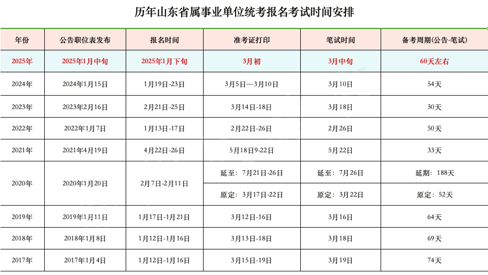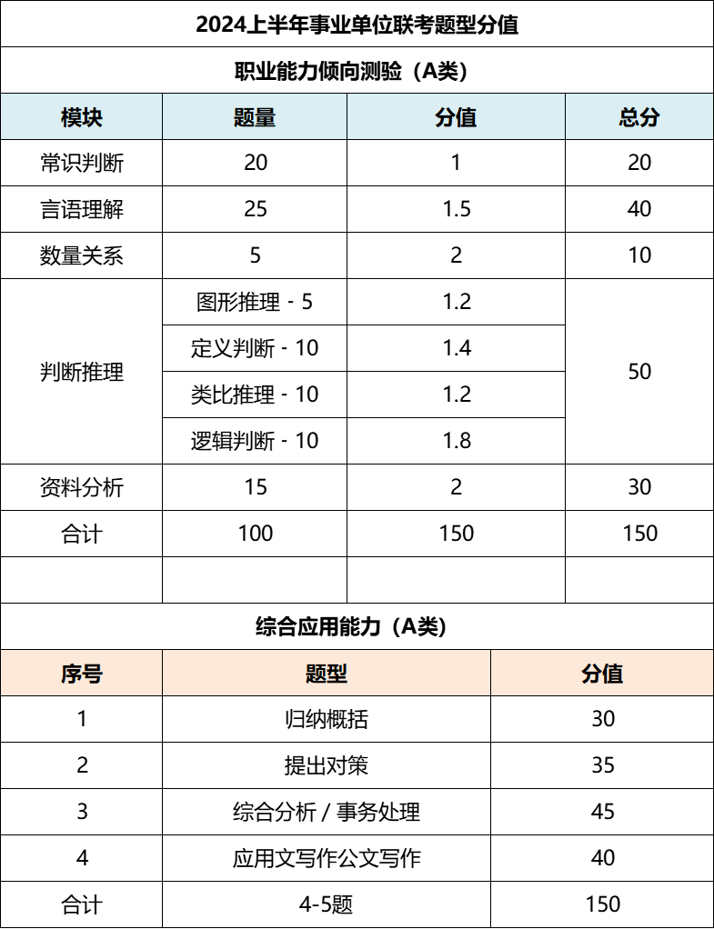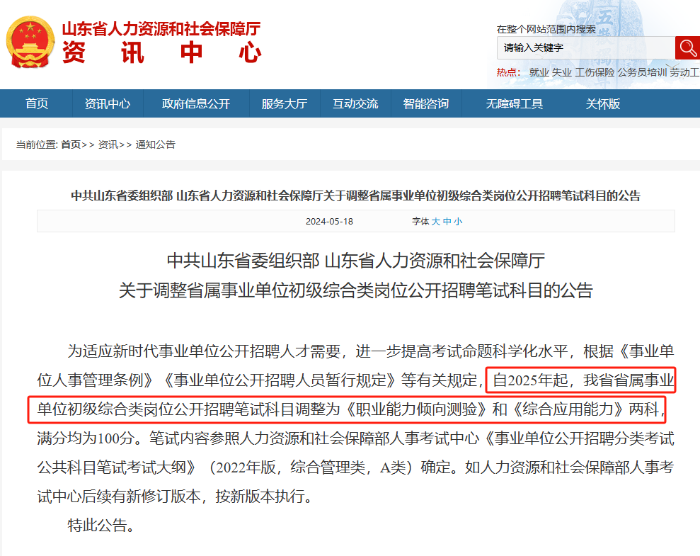 2025年山东事业单位笔试发生重要变化 笔试科目由公基和写作调整为 《职业能力倾向测验》和《综合应用能力》两科 不要担心,跟紧小编 一起来了解新考情吧! 山东省委组织部、省人力资源和社会保障厅发布公告,为适应新时代事业单位公开招聘人才需要,自 2025 年起,省属事业单位初级综合类岗位公开招聘笔试科目调整为《职业能力倾向测验》和《综合应用能力》两科,满分均为 100 分。 时间安排 ■预计公告发布时间:1月中上旬 ■预计笔试时间:3月中上旬 ■考试安排:《职业能力倾向测验》8:30-10:00,《综合应用能力》10:00-12:00,中间不休息,共3.5小时。 参加地市 山东各地市基本都参加全省统考,统一组织,统一报名,统一命题,平均竞争比62:1。 笔试内容 ■考试题型和内容 (1)《职业能力倾向测验》为客观题,满分 100 分。设置常识判断、言语理解与表达、数量关系、判断推理、资料分析等 5 种题型。主要测查考生潜在能力,即获取和应用经验、知识、技能的水平。 (2)《综合应用能力》为主观题,满分 100 分。由给定材料和作答要求两部分组成。主要测查考生发现问题、分析问题、解决问题的能力,主要测评要素包括角色意识、分析判断、计划控制、沟通协调、文字表达等。 ■题型及分值预计 ??????![]()