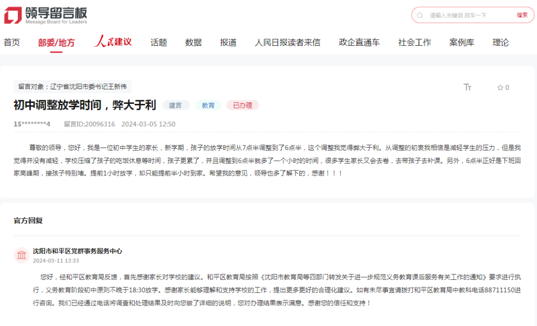 尊敬的领导,您好,我是一位初中学生的家长,新学期,孩子的放学时间从7点半调整到了6点半,这个调整我觉得弊大于利。从调整的初衷我相信是减轻学生的压力,但是我觉得并没有减轻,学校压缩了孩子的吃饭休息等时间,孩子更累了,并且调整到6点半就多了一个小时的时间,很多学生家长又会去卷,去带孩子去补课。另外,6点半正好是下班回家高峰期,接孩子特别堵。提前1小时放学,却只能提前半小时到家。希望我的意见,领导也多了解下的,感谢!!! 您好,经和平区教育局反馈,首先感谢家长对学校的建议。和平区教育局按照《沈阳市教育局等四部门转发关于进一步规范义务教育课后服务有关工作的通知》要求进行执行,义务教育阶段初中原则不晚于18:30放学。感谢家长能够理解和支持学校的工作,提出更多更好的合理化建议。如有未尽事宜请拨打和平区教育局中教科电话88711150进行咨询。我们已经通过电话将调查和处理结果及时向您做了详细的说明,您对办理结果表示满意。感谢您的信任和支持!