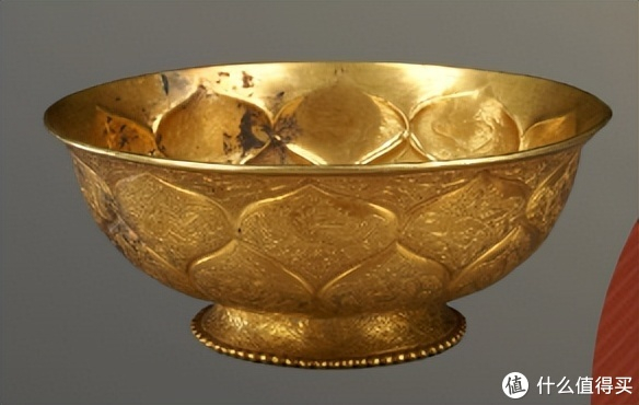 唐代金银器皿中碗的数量多,形状和形态变化大。主要有折叠碗、弧形碗、多弯碗、带盖碗等。它们大多是银制的,很少是金制的。最有名的是这两个金碗,上面有鸳鸯和莲花花瓣。
