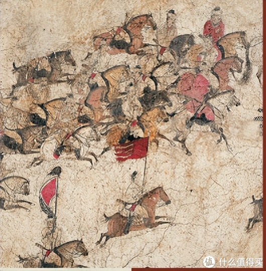 画中四位骑手骑着马从北向南作向导,然后,在骑手举着猴旗的后面是左右几十位骑手,周围是一个圆脸微微留胡子的身影,双眸,风度翩翩,身穿蓝袍,骑着一匹高大的白马,像队伍主人,他后面跟着另外十匹飞驰的马。最后,骆驼和马的行李。猎人带着弓箭,有些带着鹰,有些带着狗,还有一些带着驯化的猎豹和猞猁。