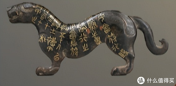 虎符上有错金铭文9行,共计40字。虎符分为左右两半,右半存于君王手中,左半则在将军手中,调兵50人以上则需左右相契合,才能下达行军指令。