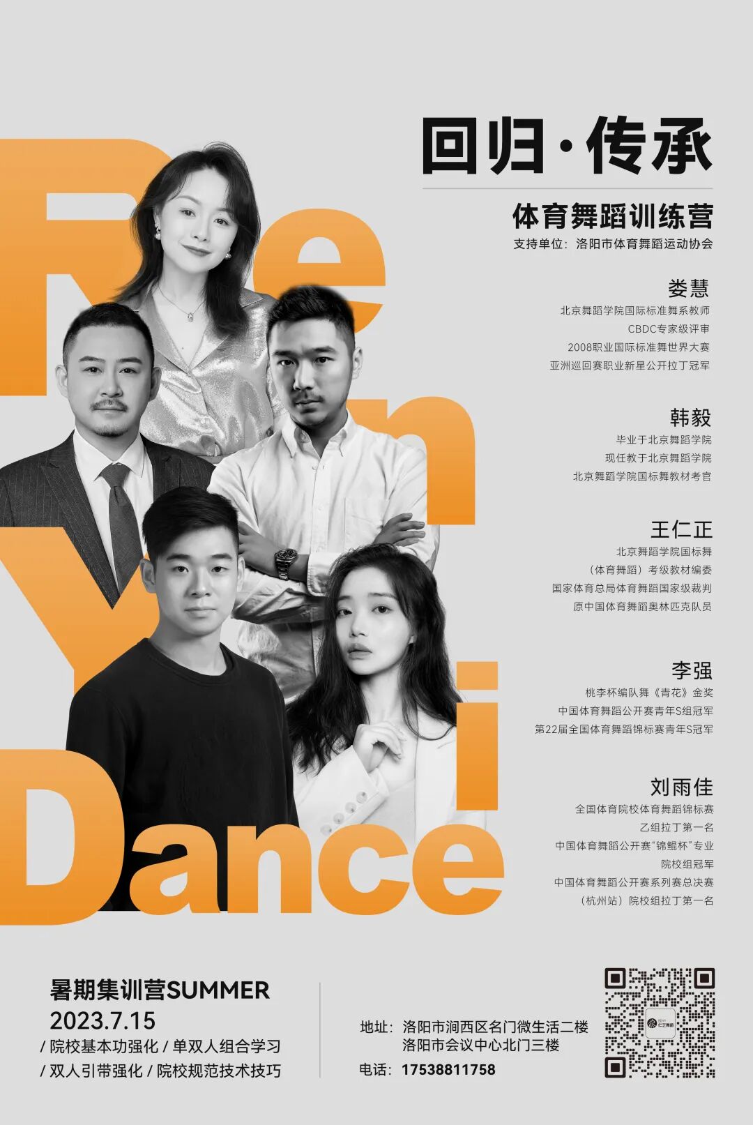 夏季的到来,阳光、热情和活力将弥漫在空气中。 如果你正在寻找一个令人兴奋的方式来度过这个夏天,我们诚挚地邀请你加入我们的体育舞蹈暑期训练营! 让舞蹈之梦翱翔,回归经典,传承精髓! 训练营将于2023年7月15日开始,为期十五天。我们的导师团队由北京舞蹈学院多位资深专业人士组成,他们将为您提供全方位的指导和训练。 为什么选择参加我们的体育舞蹈暑期训练营呢? 专业教学团队:我们的暑期训练营是由北京舞蹈学院国际标准舞系教师亲情授课,拥有出色的教学技巧和激励学生的热情。他们将带领你逐步掌握体育舞蹈的技巧和风格。 多样化的课程内容:我们的训练营涵盖了院校基本功强化/单双人组合学习/双人引带强化/院校规范技术技巧,让你在夏季尽情展现自己的舞姿。 舒适的学习环境:我们的培训场所设施完备,舒适激情舞蹈宽敞。你将在友好的氛围中学习,放松身心,尽情投入舞蹈的世界。 不要错过这个难得的机会,让夏日的激情与体育舞蹈的热情碰撞! 导师介绍: 娄慧:北京舞蹈学院国际标准舞系教师,CBDC专家级评审,2008职业国际标准舞世界大赛亚洲巡回赛职业新星公开拉丁冠军。 韩毅:毕业于北京舞蹈学院,现任教于北京舞蹈学院国标舞教材考官。 王仁正:北京舞蹈学院国标舞(体育舞蹈)考级教材编委,国家体育总局体育舞蹈国家级裁判,曾是中国体育舞蹈奥林匹克队员。 李强:桃李杯编队舞《青花》金奖中国体育舞蹈公开赛青年S组冠军第22届全国体育舞蹈锦标赛青年S冠军 刘雨佳:全国体育院校体育舞蹈锦标赛乙组拉丁第一名,中国体育舞蹈公开赛“锦鳃杯”专业院校组冠军,中国体育舞蹈公开赛系列赛总决赛(杭州站)院校组拉丁第一名。 训练营将提供专业的培训环境和系统的基础训练,让您的舞蹈技巧得到全面提升。我们鼓励学员回归舞蹈的经典,传承舞蹈的精髓。 参与训练营,您将有机会亲身感受北京舞蹈学院国际标准舞系的教学风格和专业水平。同时,洛阳仁艺舞蹈将为您提供优质的培训服务,倾囊相授。 让我们一同开启舞蹈之旅,体验专业教学,感受舞蹈的魅力!![]()